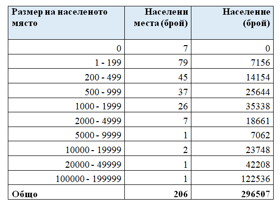Населените места без население са 7. Най-голям е броят на населените места с население от 1 до 199 души - 79.
