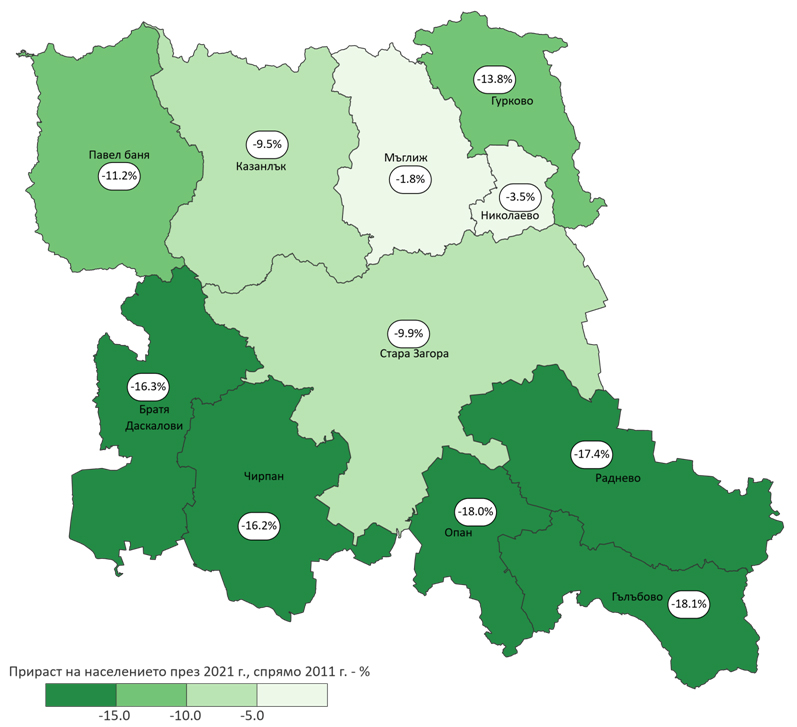 През десетгодишния период между двете преброявания е регистрирано намаление на населението на всички общини, като най-голямо е в общините Гълъбово (-18.1%) и Опан (-18.0%). Общо за седем общини намалението е над средното за област Стара Загора. Най-малка загуба на население има при общините Мъглиж (-1.8%) и Николаево (-3.5%).