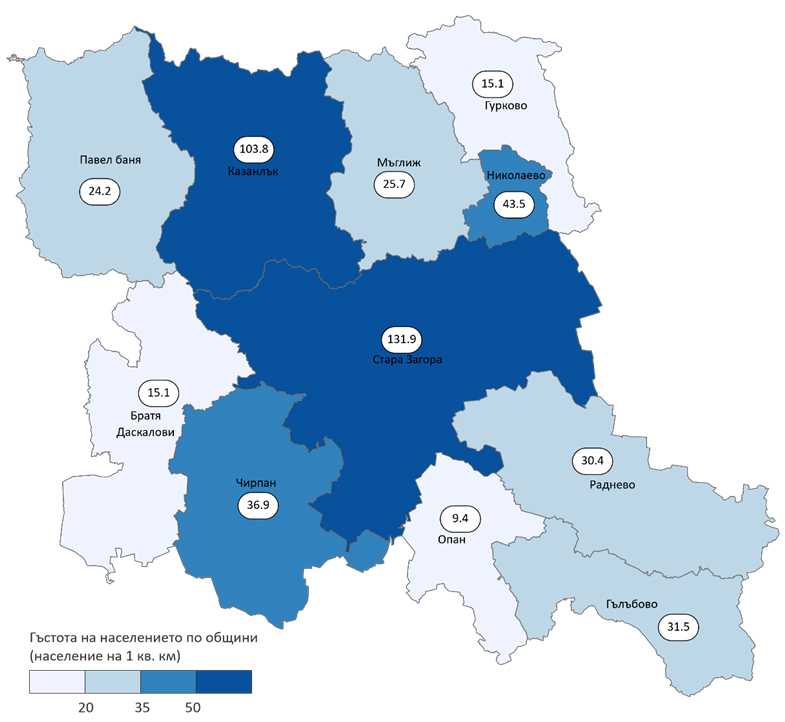 Гъстотата на населението по общини варира от 9.4 души на кв. км. за община Опан до 131.9 души на кв. км. в община Стара Загора.