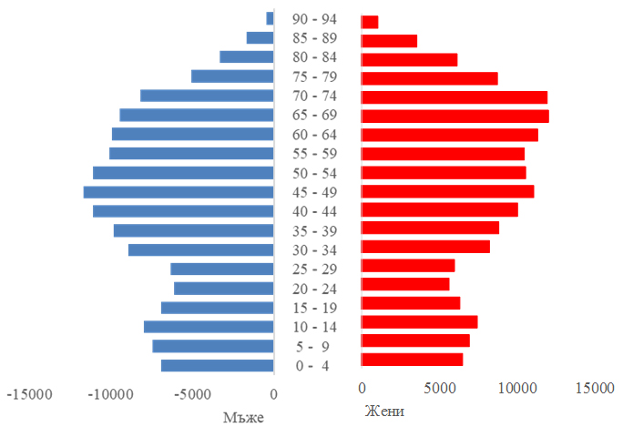 Продължават да се задълбочават негативните тенденции в изменението на възрастовата структура на населението. Налице е продължаващ процес на демографско остаряване, който се изразява в увеличаване на абсолютния брой и относителния дял на населението на възраст 65 и повече навършени години.