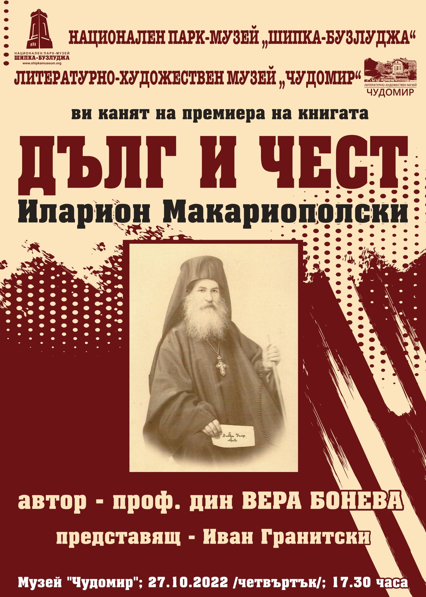 Национален парк-музей „Шипка-Бузлуджа” и литературно художествен музей „Чудомир” ви канят на премиерата на книгата „Дълг и чест. Иларион Макариополски”. Автор на изданието е проф. дин Вера Бонева, която ще се срещне с казанлъчани на 27 октмоври, четвъртък, в 17:30 часа, в музей „Чудомир”. Представящ – Иван Гранитски.