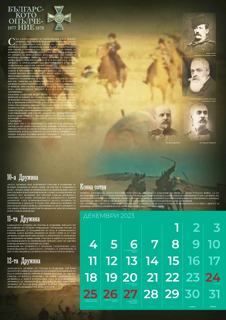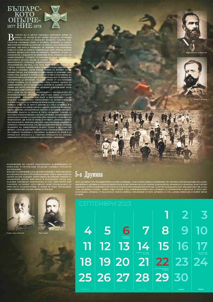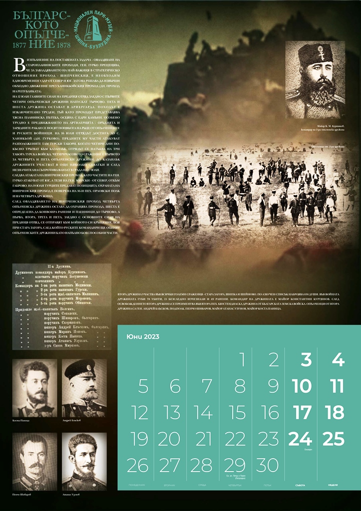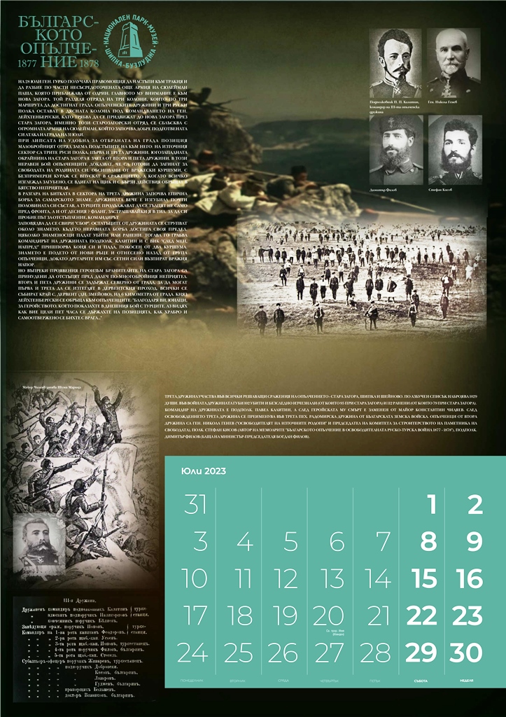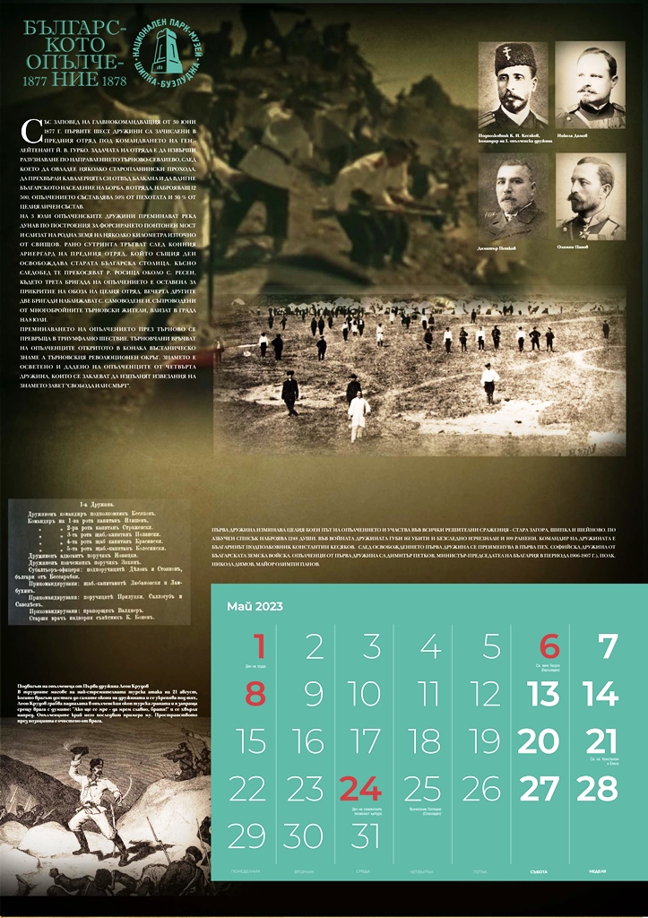 Излезе от печат календарът на Националния парк-музей „Шипка-Бузлуджа“ за 2023 година „Българското опълчение 1877-1878“, посветен на 145-ата годишнина от Освобождението на България. Голям, многоцветен, с множество архивни снимки, той съдържа интересна информация за Опълчението и за отделните дружини, за техния боен път и сраженията, в които са участвали.