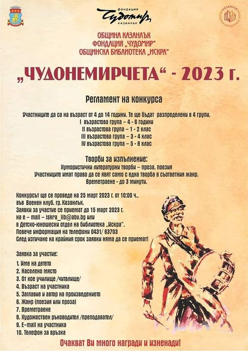 От Общинска библиотека „Искра” напомнят, че днес, 15 март, е последният срок за подаване на заявки за участие в традиционния конкурс за изпълнение на хумористични творби „Чудонемирчета 2023”. Заявки, подадени след определения срок, няма да се приемат.