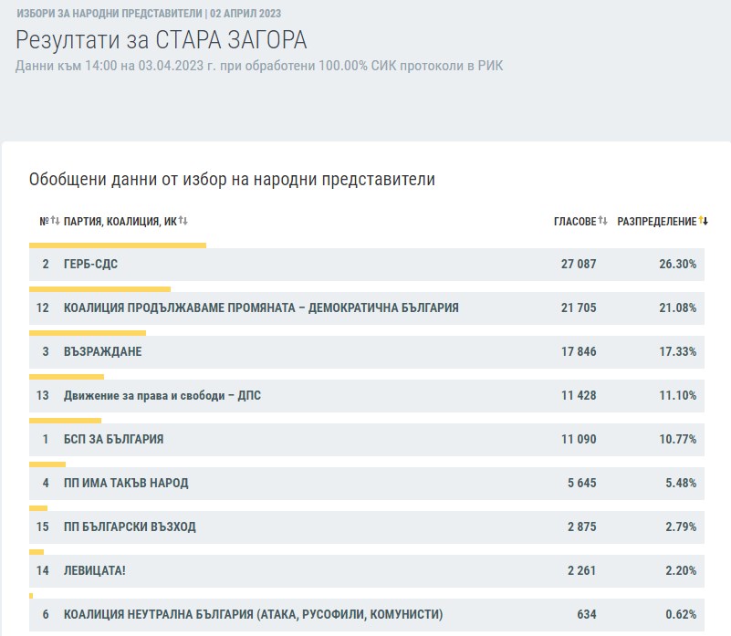 В РИК Стара Загора резултатите от парламентарните избори вече са обработени на 100 %. Единствената разлика в подредбата от по-рано днес е, че ДПС измества с една позиция БСП.