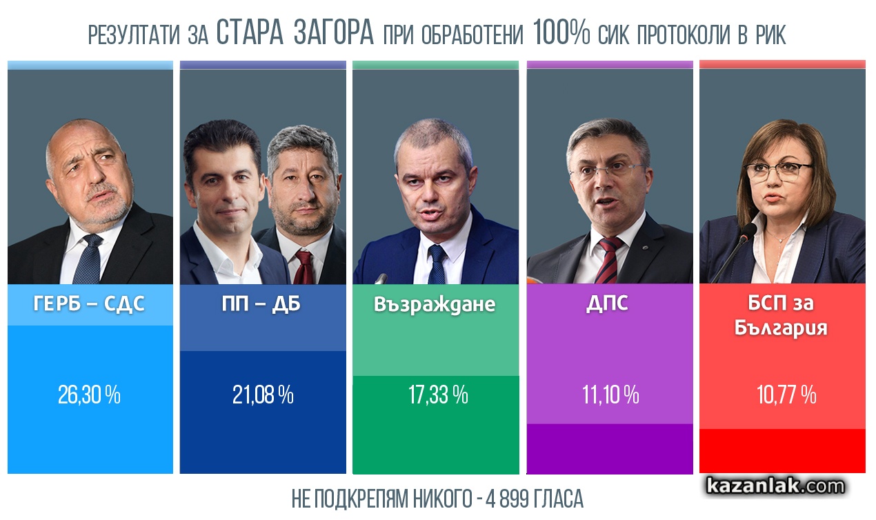 На първо място в Старозагорско, при обработени 100.00% СИК протоколи в РИК, остава коалицията ГЕРБ-СДС с 26,30% от подадените гласове, или 27 087 гласа.