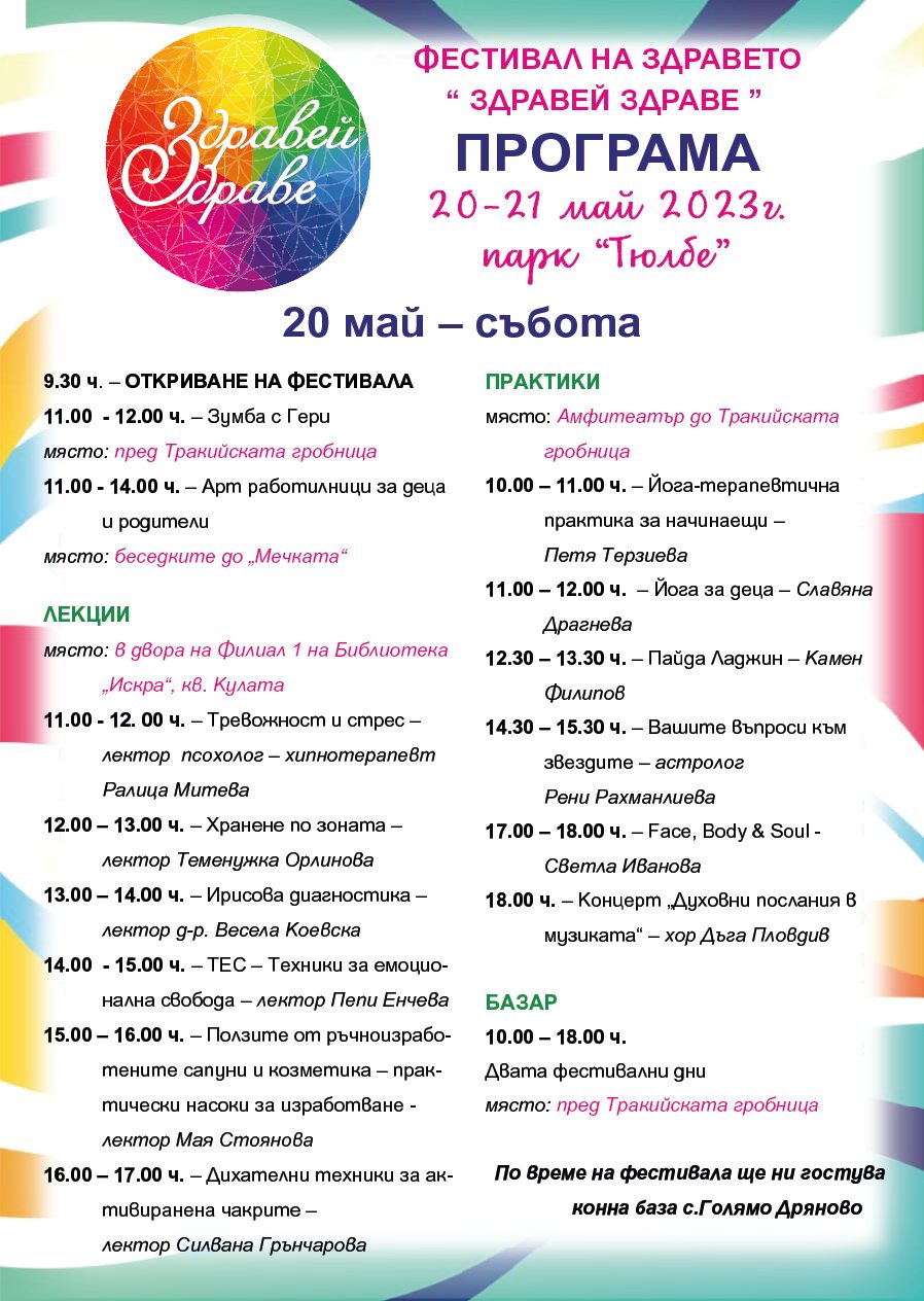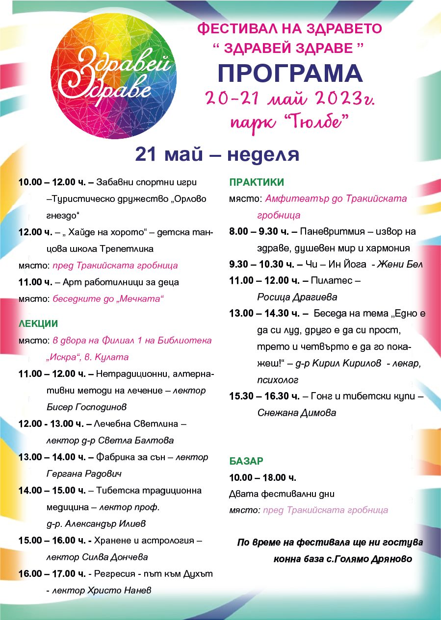 За девета поредна година в Казанлък ще се състои традиционния фестивал „Здравей, здраве“. Тазгодишното издание ще се проведе на 20 и 21 май /събота и неделя/ в парк „Тюлбе“.