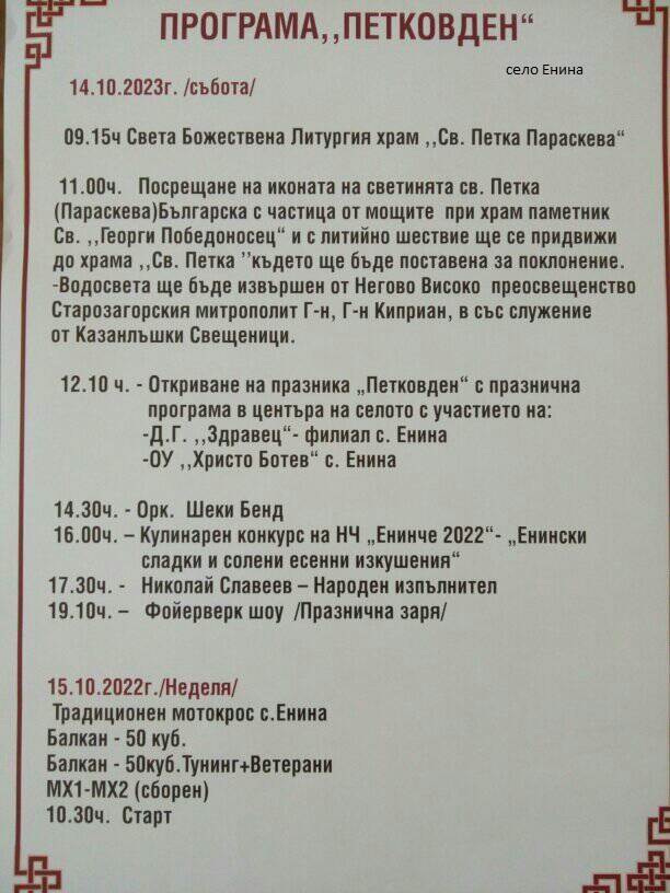 Петковден ще започне в Енина със Света Божествена Литургия в храм „Света Петка Параскева“, след което ще бъде посрещната иконата на светинята Св. Петка (Параскева) Българска с частица от мощите при храм паметник Св. Георги Победоносец“ и с литийно шествие ще се придвижи до храма „Св. Петка“ където ще бъде поставена за поклонение. Водосвета ще бъде извършен от Негово Високо преосвещенство Старозагорки митрополит Киприан, в съслужие от Казанлъшки Свещеници.