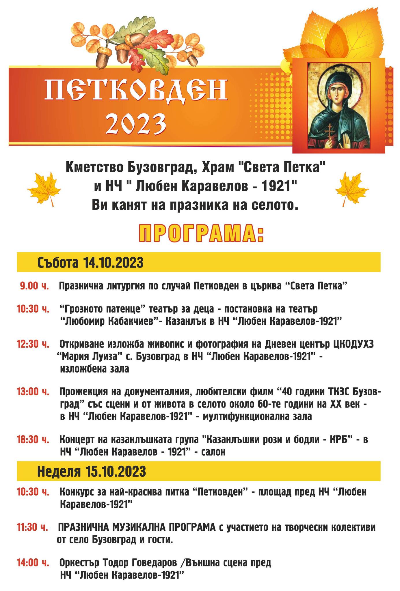 Село Бузовград също празнува на Петковден. Програмата за тържествата в селото ще започне с Празнична литургия по случай Петковден в църква „Света Петка“ от 9:00 часа и ще продължи с детската постановка „Грозното патенце“ представена от театър „Любомир Кабакчиев“ - Казанлък от 10:30 часа НЧ „Любен Каравелов-1921“.