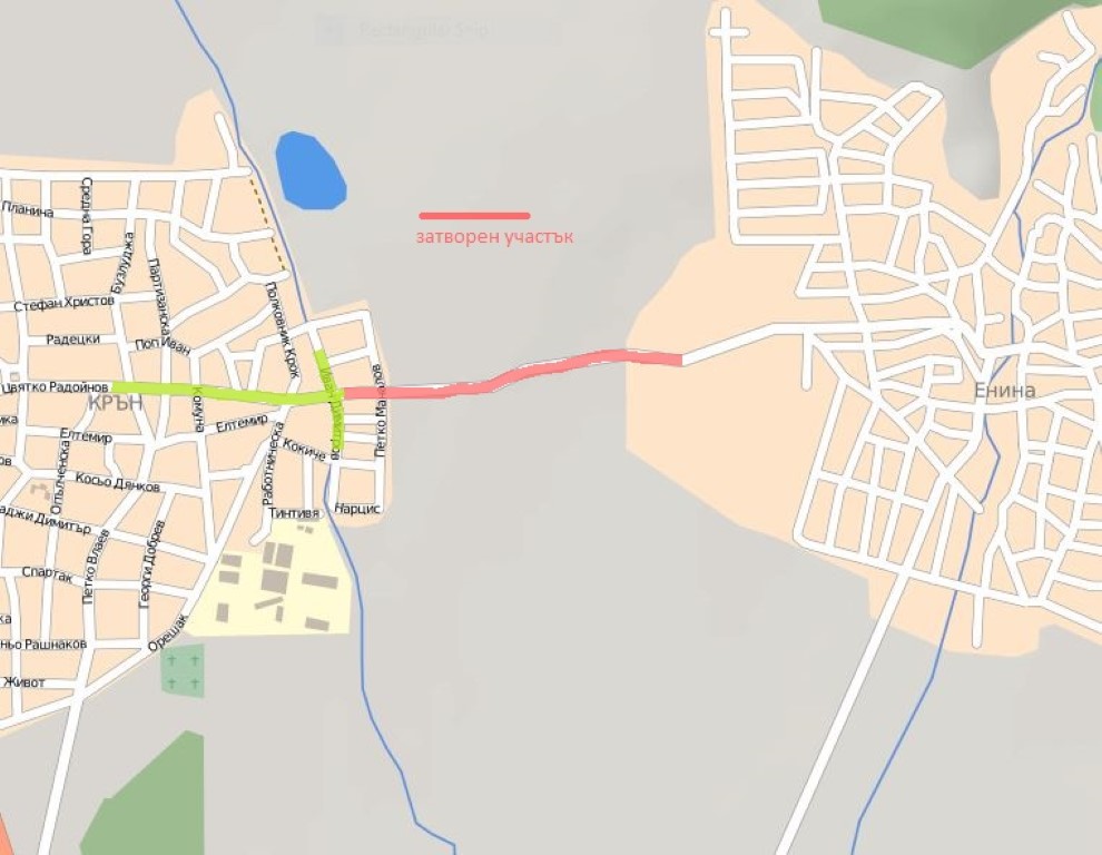 От утре, събота, 21.10.2023 г., за два дни се въвежда временната организация и безопасност на движението в град Крън във връзка с изпълнение на проект “Изграждане на ВиК инфраструктура за територията на град Крън, I етап на строителство, III подетап”. В зависимост от етапа на строително-монтажните дейности по ВиК инфраструктурата , за движение, спиране и паркиране на пътни превозни средства ще бъдат затвоарени участъци по ул. „Цвятко Радойнов“ и пътя Енина – Крън/ Крън – Енина, както следва: