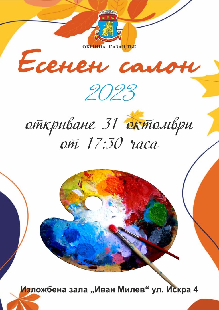 За 23-и пореден път художниците на Казанлък подредиха в „Есенен салон“ своите работи от последния творчески сезон в Изложбена зала „Иван Милев“ в Културно-информационния център на ул.“Искра“№4. 39 автори, родом от града или свързани с Казанлък, показват картини и пластики заедно в общо културно събитие.