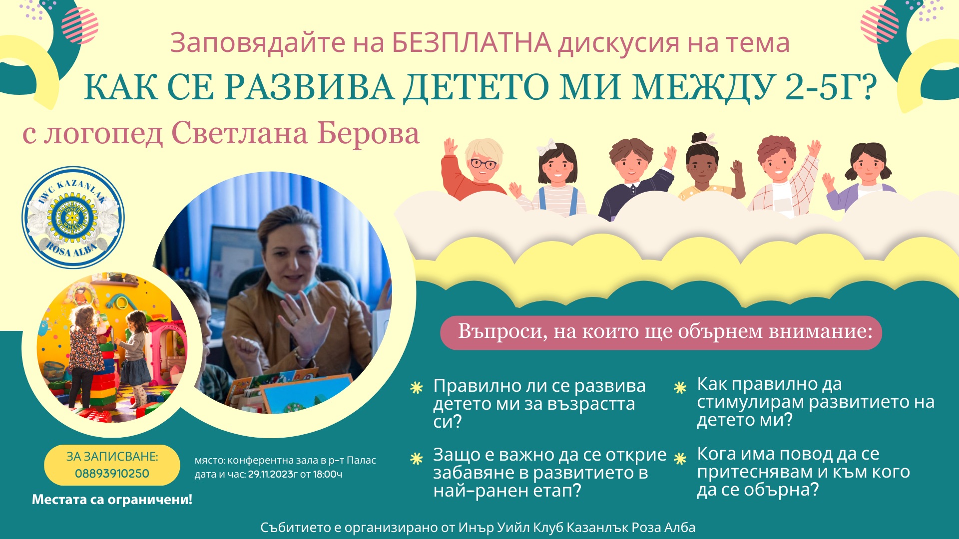 На 29-ти ноември от 18:00 часа в конферентната зала на х-л Палас ще се състои публична дискусия на тема „Как се развива детето ми между 2-5г.“ с гост-лектор Светлана Берова. Организатор на събитието е Инър Уийл клуб Казанлък „Роза Алба“.