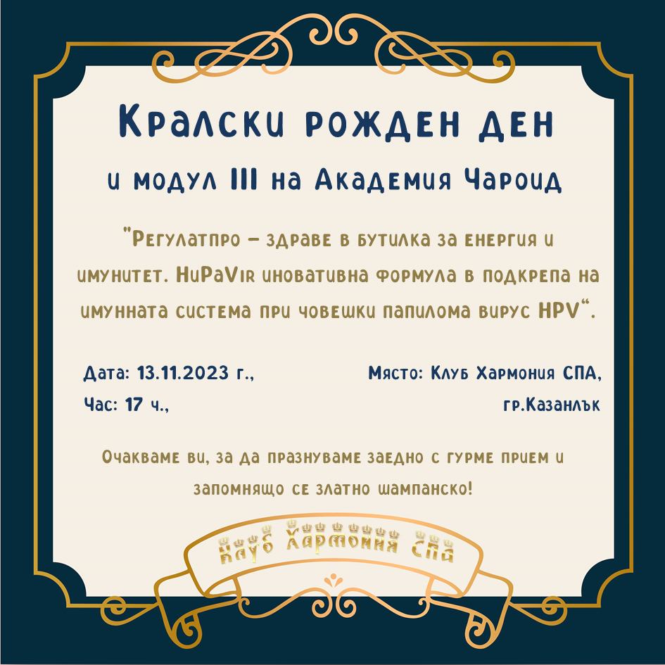 Клуб "Хармония" СПА ви кани на едно от най-очакваните събития тази есен – Кралския рожден ден на професионалиста Юлия Забунова, който ще се състои на 13-ти ноември от 17:00 часа в изисканата обстановка на казанлъшкия клуб.