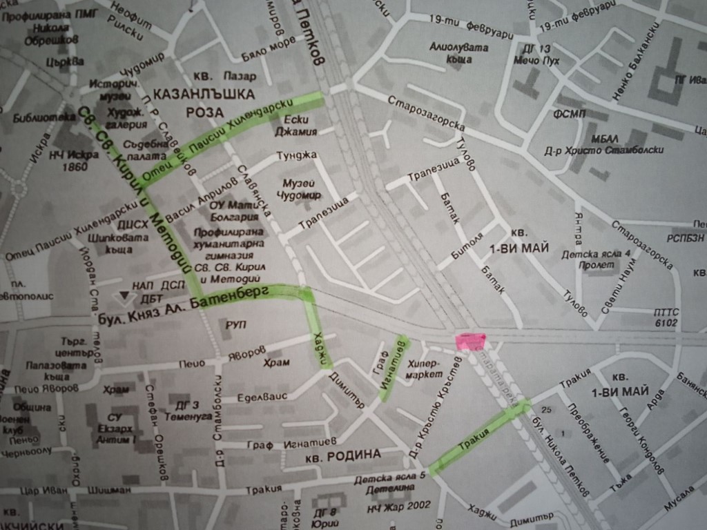Въвежда се временен режим на движение на ППС по обходните улици: ул.„Хаджи Димитър“, ул.„Граф Игнатиев“, ул.„Св. Св. Кирил и Методий“, ул.„Отец Паисий Хилендарски“, ул.„Тракия“ към съществуващата улична мрежа в Казанлък.