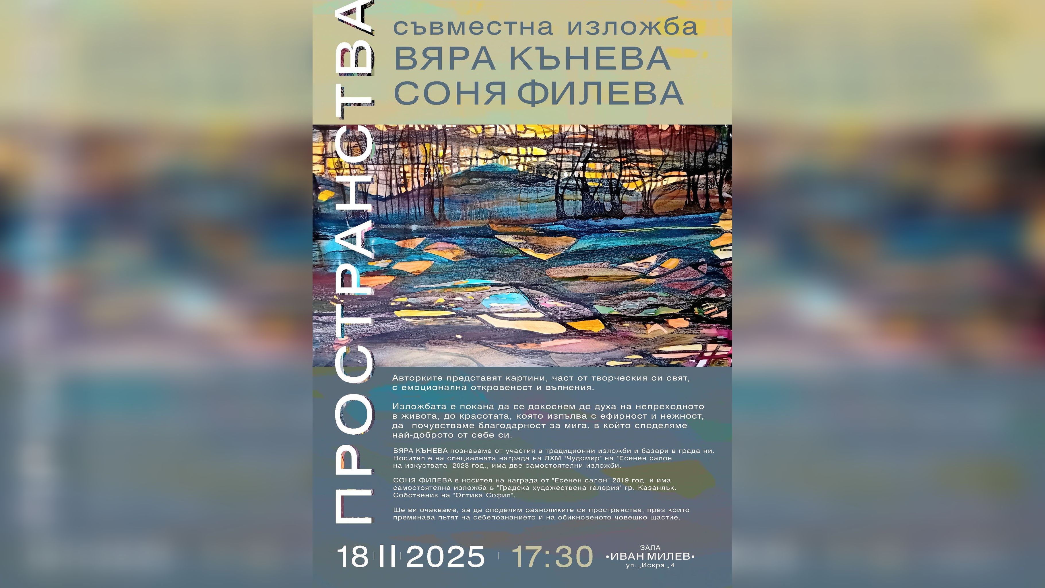 Творците Вяра Кънева и Соня Филева ще представят на 18-ти февруари, от 17:30 часа в зала „Иван Милев“ на ул.“Искра“4 в град Казанлък, своята съвместна изложба „Пространства“. В нея, художничките са включили картини, част от техния артистичен свят, изпълнен с емоционална откровеност и вълнения.