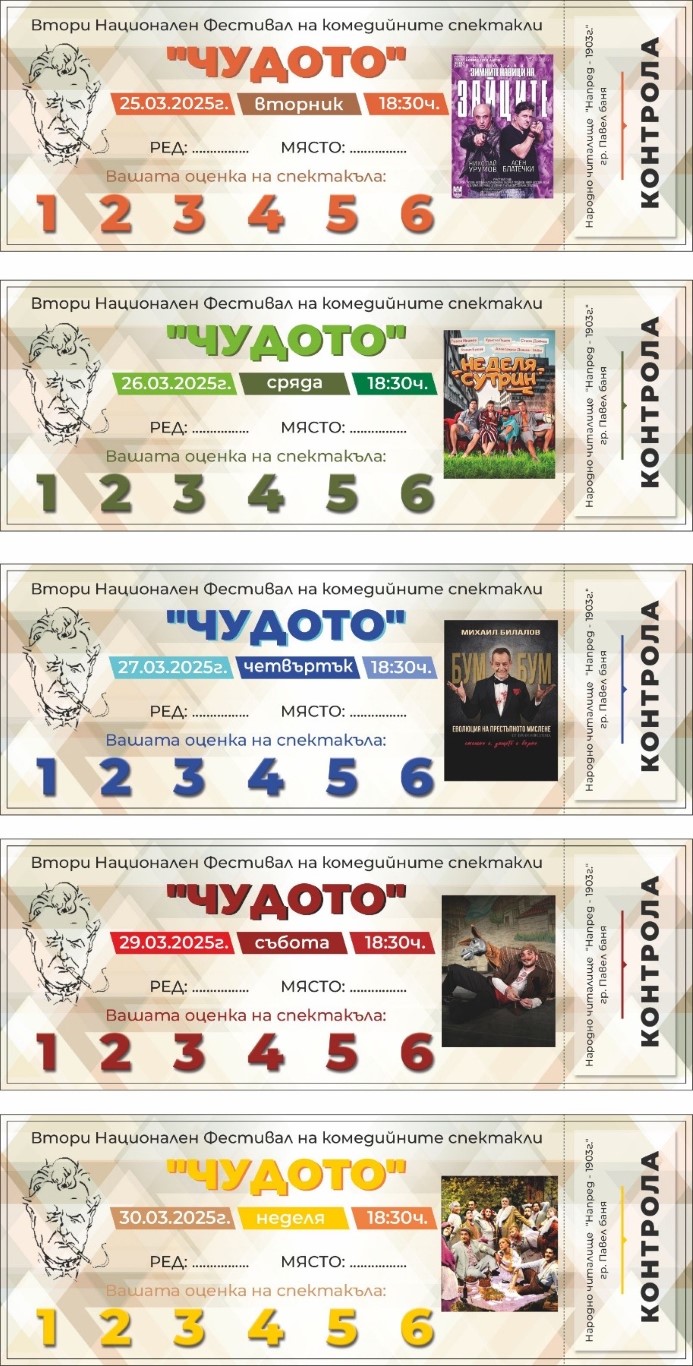 От днес (13 февруари) започна продажбата на билети за представленията във II-рия Национален фестивал на комедийните спектакли „ЧУДОТО” в Павел баня. Петте спектакъла ще се играят на сцената на НЧ „Напред-1903” и са с начален час 18:30 часа. Фестивалът, който е само за българска комедия, започва на 25 март, когато е и рожденият ден на Димитър Чорбаджийски – Чудомир.