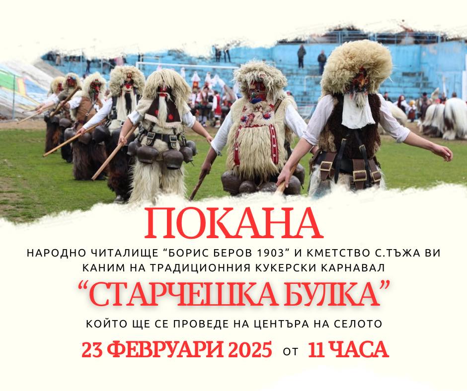 Народно читалище „Борис Беров 1903“ и кметство село Тъжа ви канят на ежегодния кукерски карнавал „Старчешка булка“, който ще се състои на 23 февруари от 11:00 часа в центъра на селото.