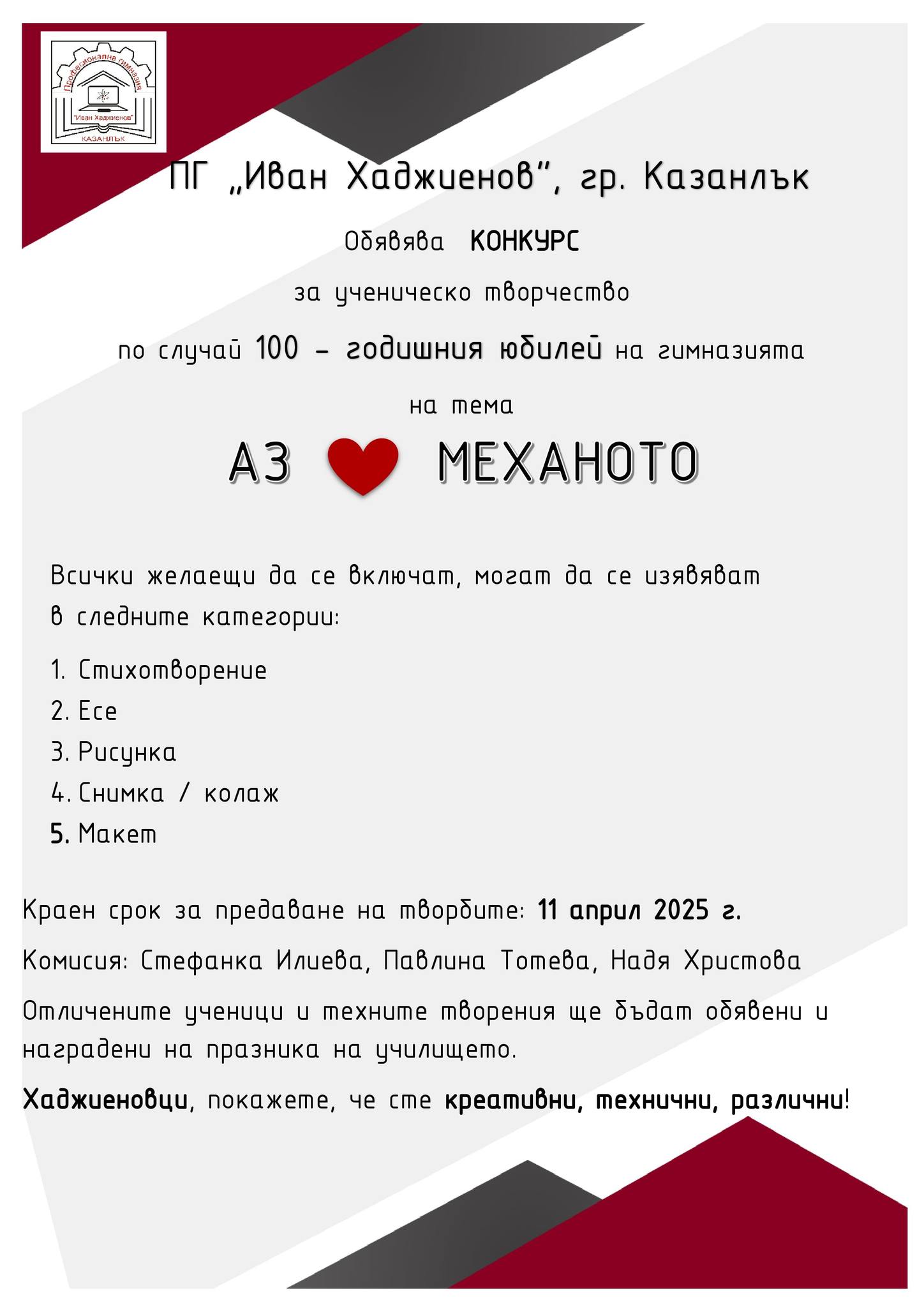 По случай 100-годишния юбилей на гимназията е обявен ученически конкурс на тема "Аз обичам Механото".
