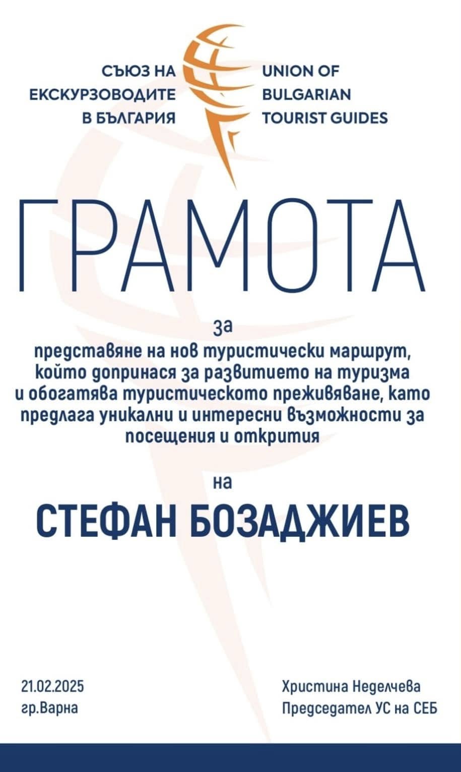 Събитието се осъществи със съдействието на Стефан Бозаджиев - член на Управителния съвет на Съюза на екскурзоводите в България. Екскурзоводът бе удостоен и със специална грамота от Христина Неделчева - председател на Съюза.