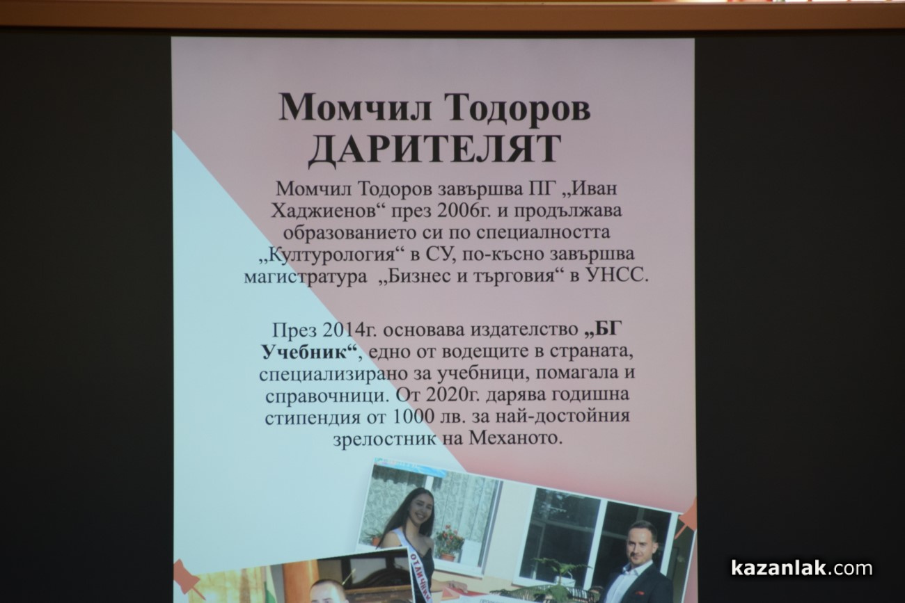 Стоян Петров завършил специалност „Строителство и архитектура“ и носител на приза през 2020 г., Христо Князов от „Компютърна техника и технологии“ (2021), Йоана Велева „Строителство и архитектура“ (2022), Антонина Атанасова „Компютърна техника и технологии“ (2023) и Даниел Христов „Компютърна техника и технологии“ (2024), споделиха пред учениците, че именно обучението им в Механото е поставило добрата основа за техните настоящи успехи. И петимата хаджиеновци, вече студенти, а някои от тях съчетаващи и ученето с работа, застанаха зад тезата, че качественото образование, което са получили в гимназията, е било значим фактор, с чиято помощ са продължили да вървят напред, към сбъдването на мечтите си.