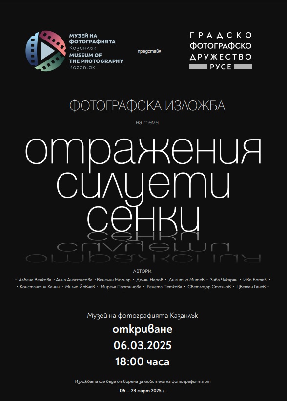 Настоящата изложба е тематична със заглавие „Отражения, силуети, сенки” и ще бъде показана за първи път в Музей на фотографията Казанлък.