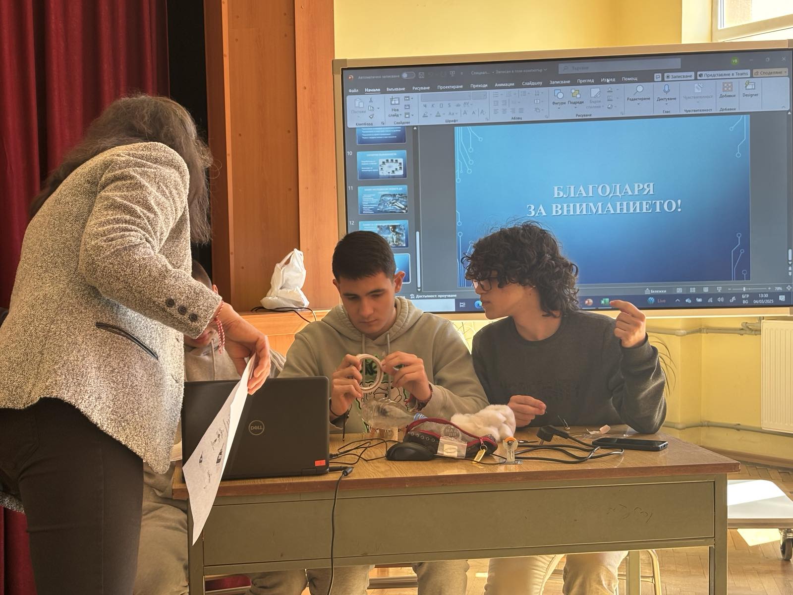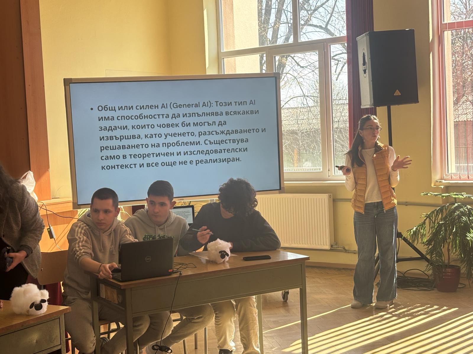 Учениците от 11 клас /Тодор Йоргов и Валентина Буйнукова/ бяха подготвили два материала, с които представиха възможностите на специалността, която изучават, и най- новото в компютърната наука - изкуственият интелект.