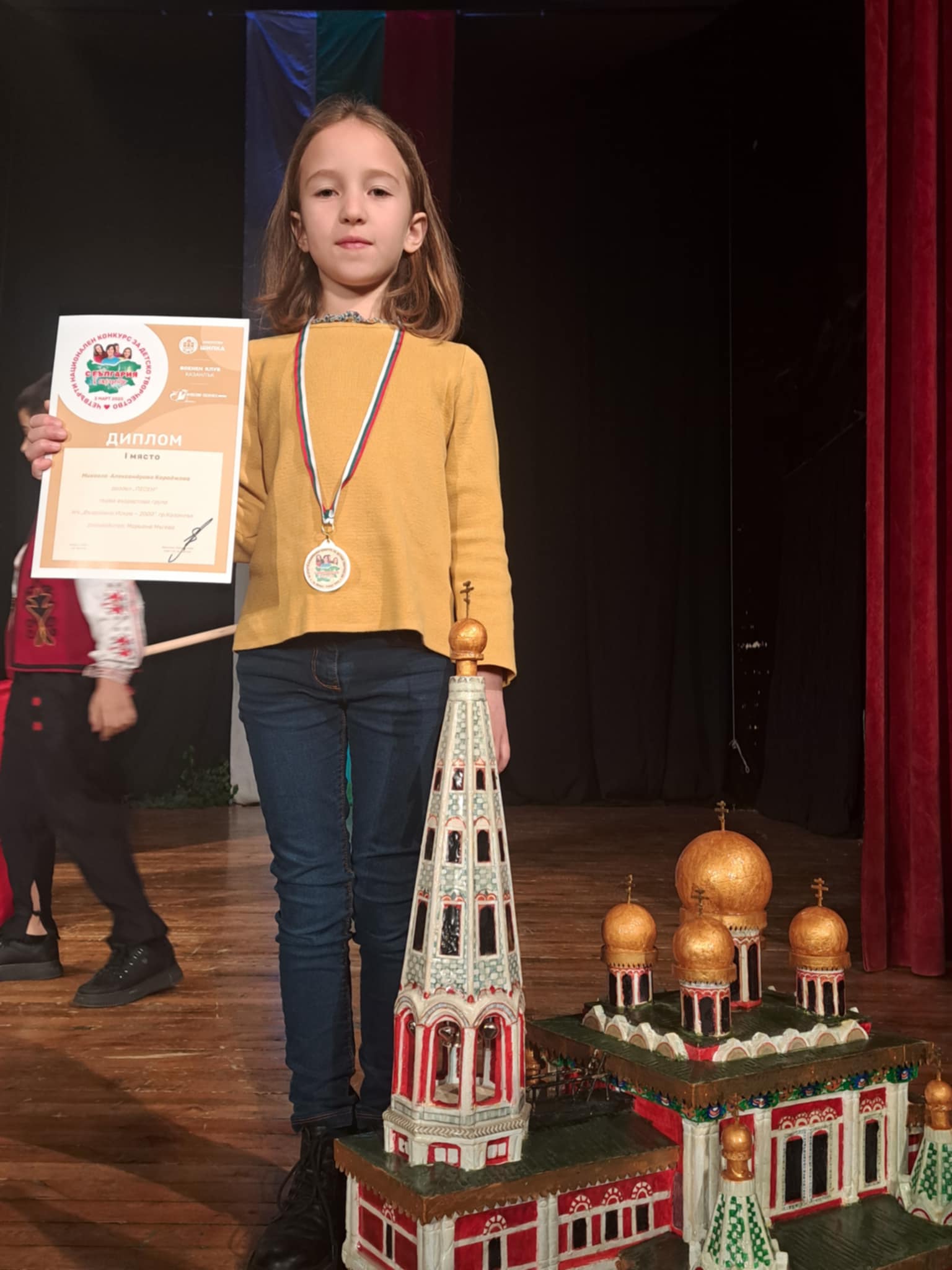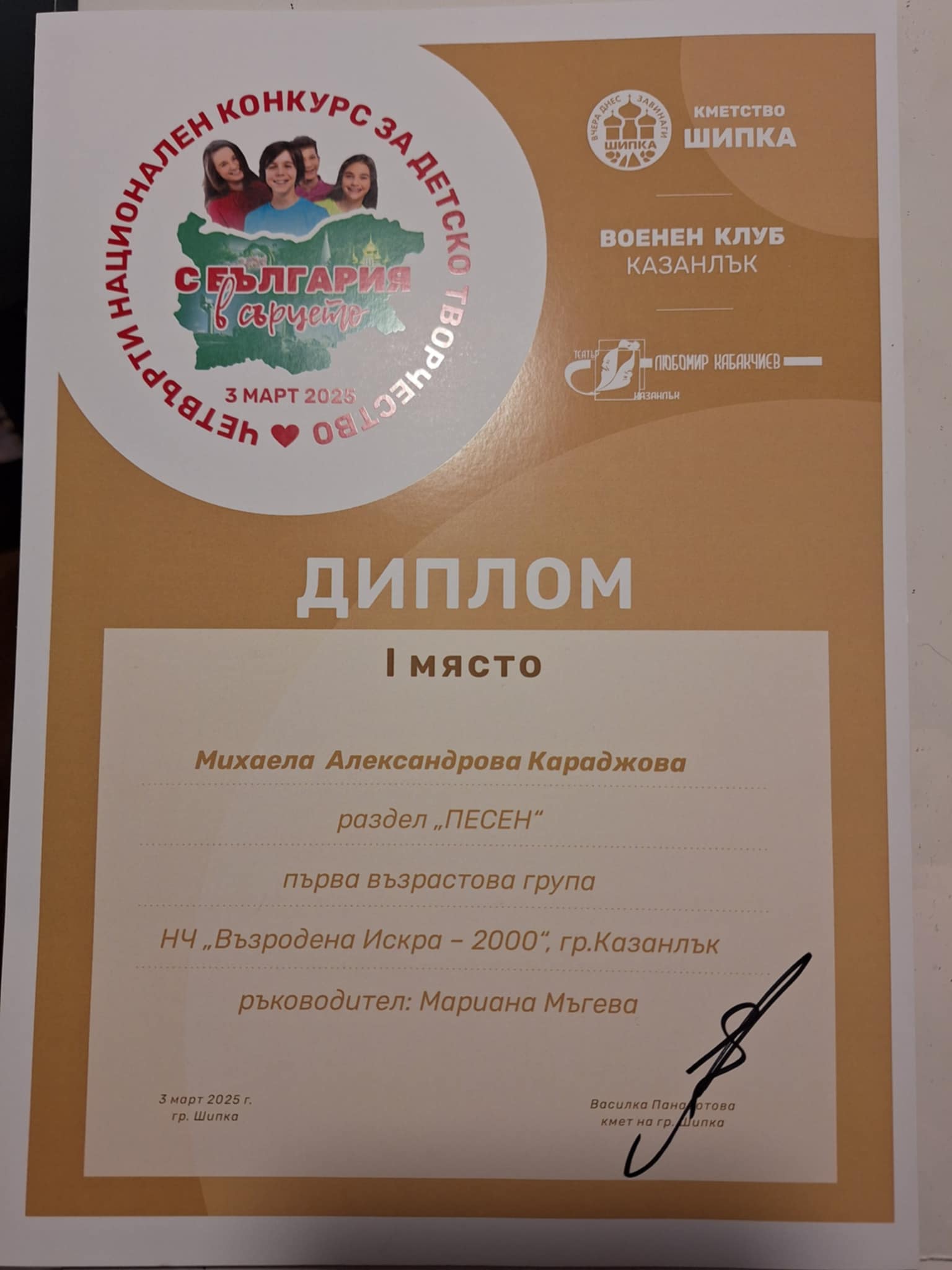 С първо място бе отличена и Михаела Караджова - 8г. на Националния конкурс за български патриотични песни и стихове ,,С България в сърцето‘‘, организиран от Община Шипка и музикалния педагог Надя Тончева. Финалният гала-концерт се проведе във Военен клуб - Казанлък на 3 март, а в него взеха участие децата отличени с 1-во място.