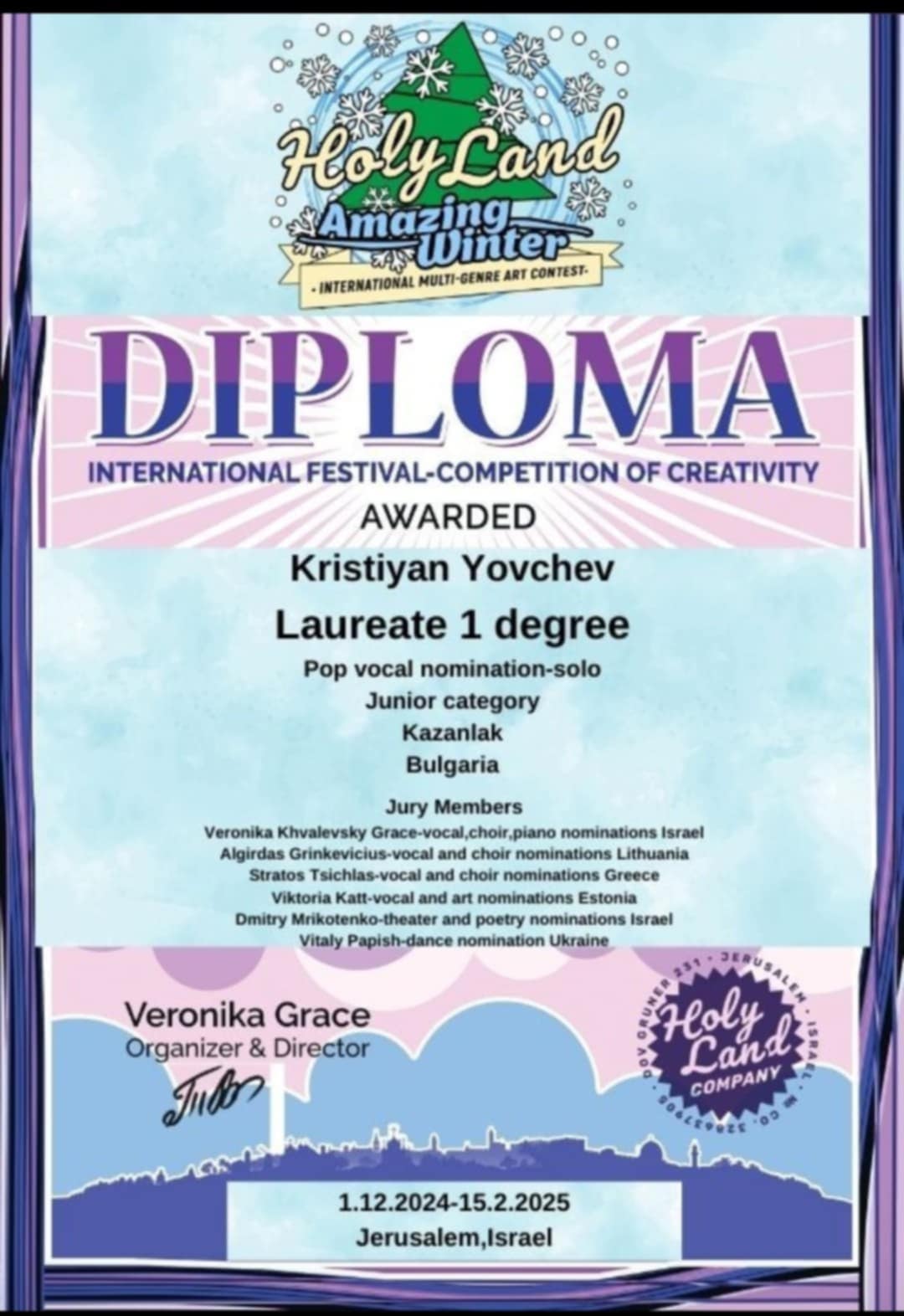 За своето вълнуващо изпълнение на италианска песен Кристиян Йовчев - 6г. получи Първо място и златен медал от Международния онлайн конкурс ,,Holy Land’’,Израел провел се на 1-ви март т.г. Международното жури в него бе от утвърдени световни оперни и поп певци.