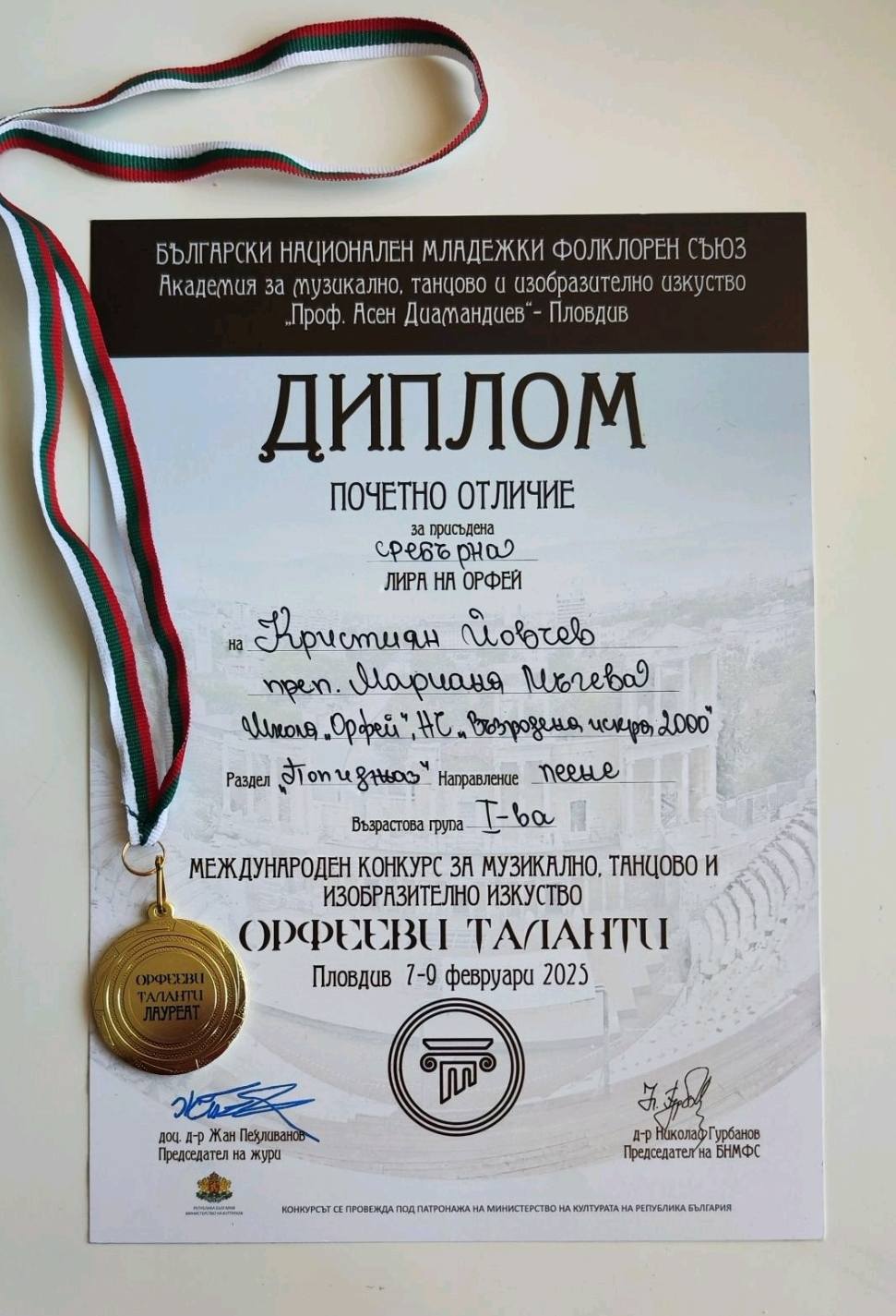 Талантливият Кристиян само преди месец получи Сребърна лира от Националния конкурс ,,Орфееви таланти‘‘, организиран от АМТИИ, Пловдив.