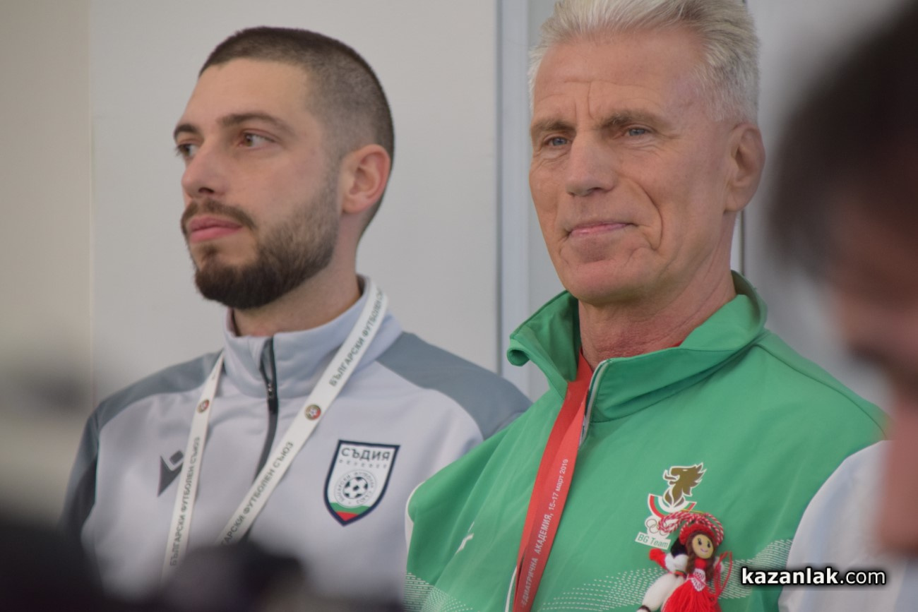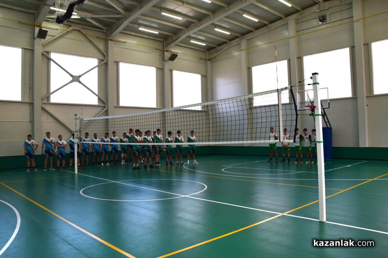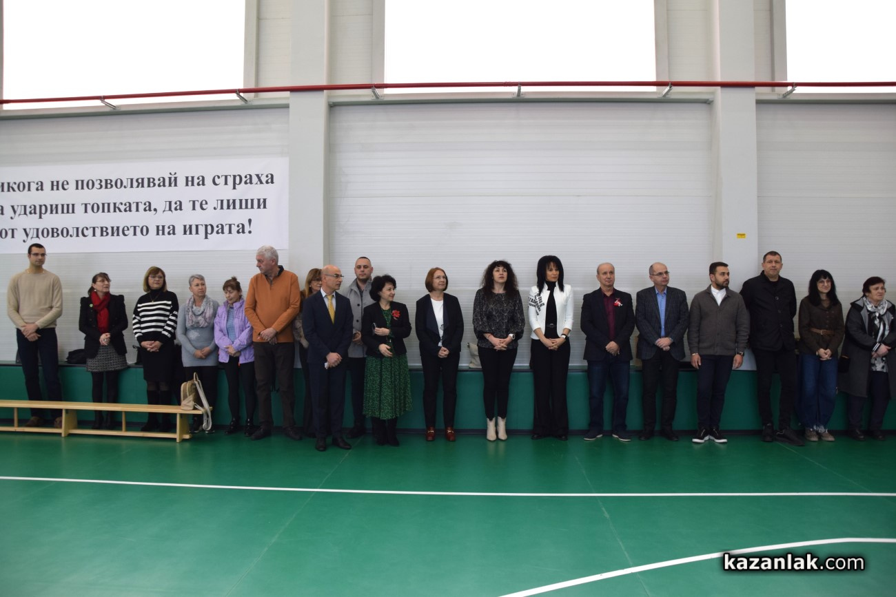 Приветствено слово изнесе директорът на гимназията Красимир Дамянов. Той си припомни своите ученически години, когато през 1984-85г. се прави първа копка за построяване на физкултурен салон. Във времето този проект не се изпълнява, и сега, след близо 40 години, без много помпозност и излишна официалност, за период от 2г. и половина, Община Казанлък с много труд и усилия правят всичко възможно спортният салон да бъде факт.