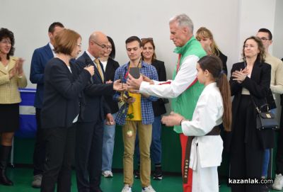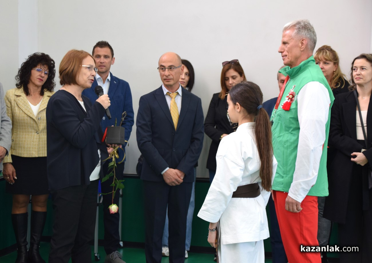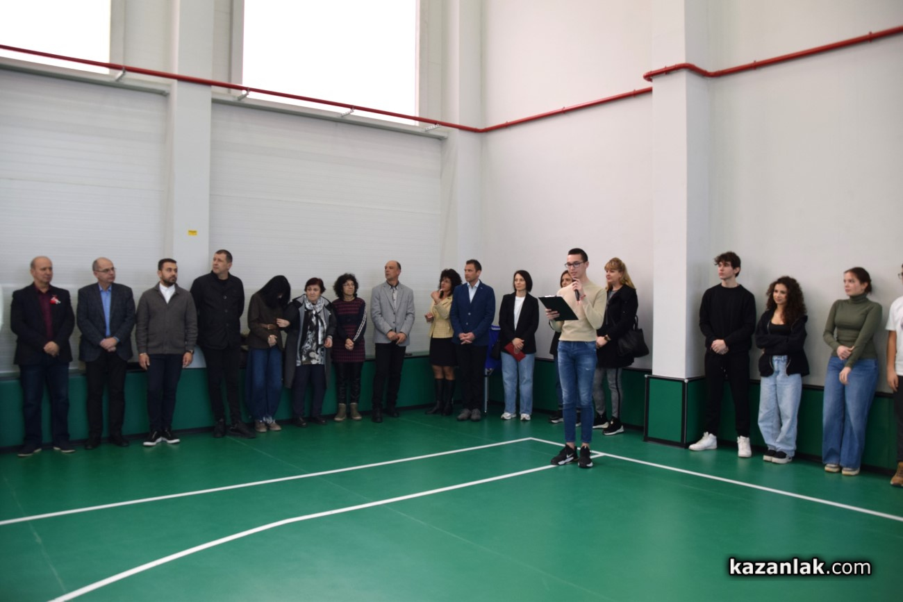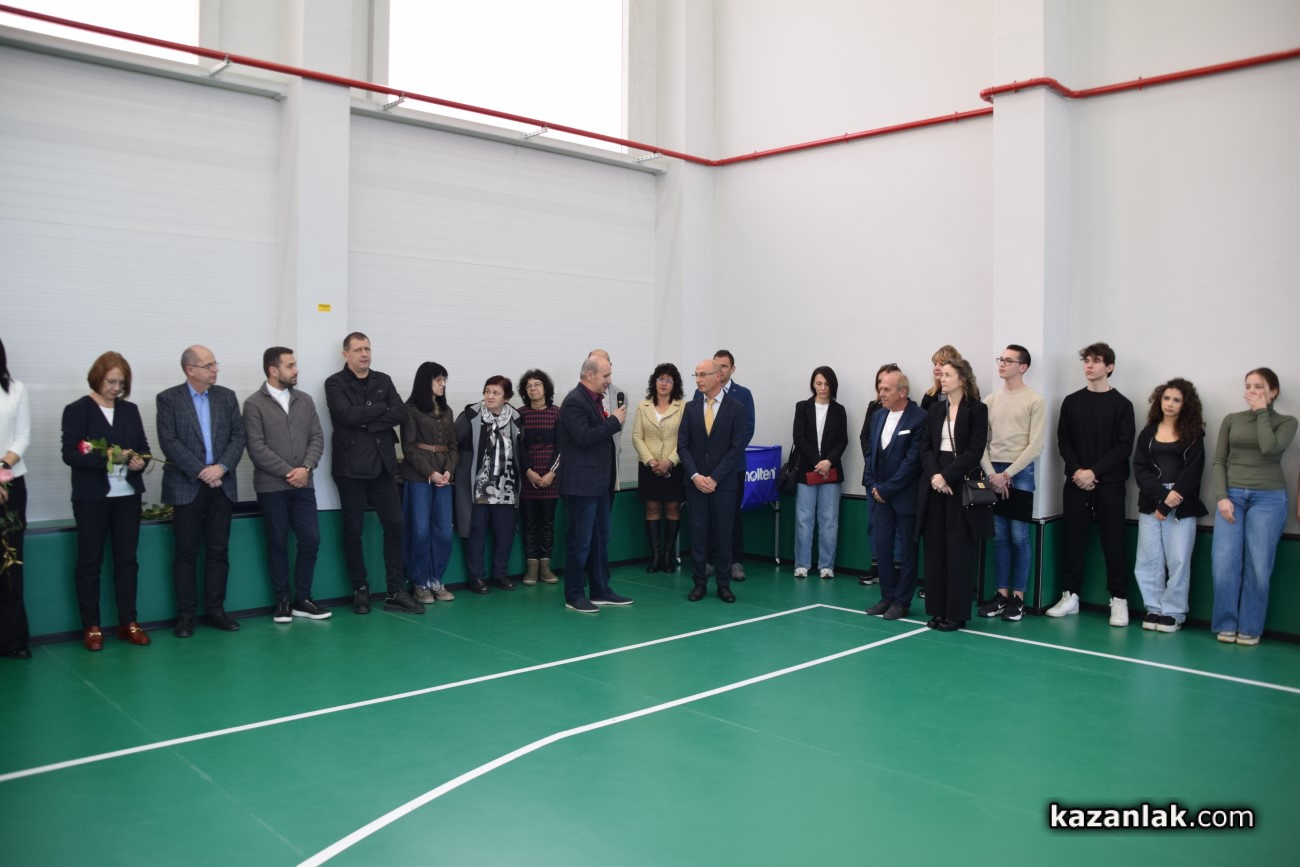 След обръщението на директора на Математическата гимназия, кметът на Казанлък Галина Стоянова връчи Ключа за новото съоръжение на доайена на учителите по "Физическо възпитание и спорт" Николай Скляров и европейската шампионка по бойни изкуства, ученичка в училището. Кметът се обърна към учениците с благодарствени думи за участието им в обществения живот "вие сте образец за подражание". Строежът на нови физкултурни салони са стартирал и в училищата в селата Енина и Хаджидимитрово, ОУ "Мати Болгария" и ОУ "Антон Страшимиров", допълни още Стоянова.