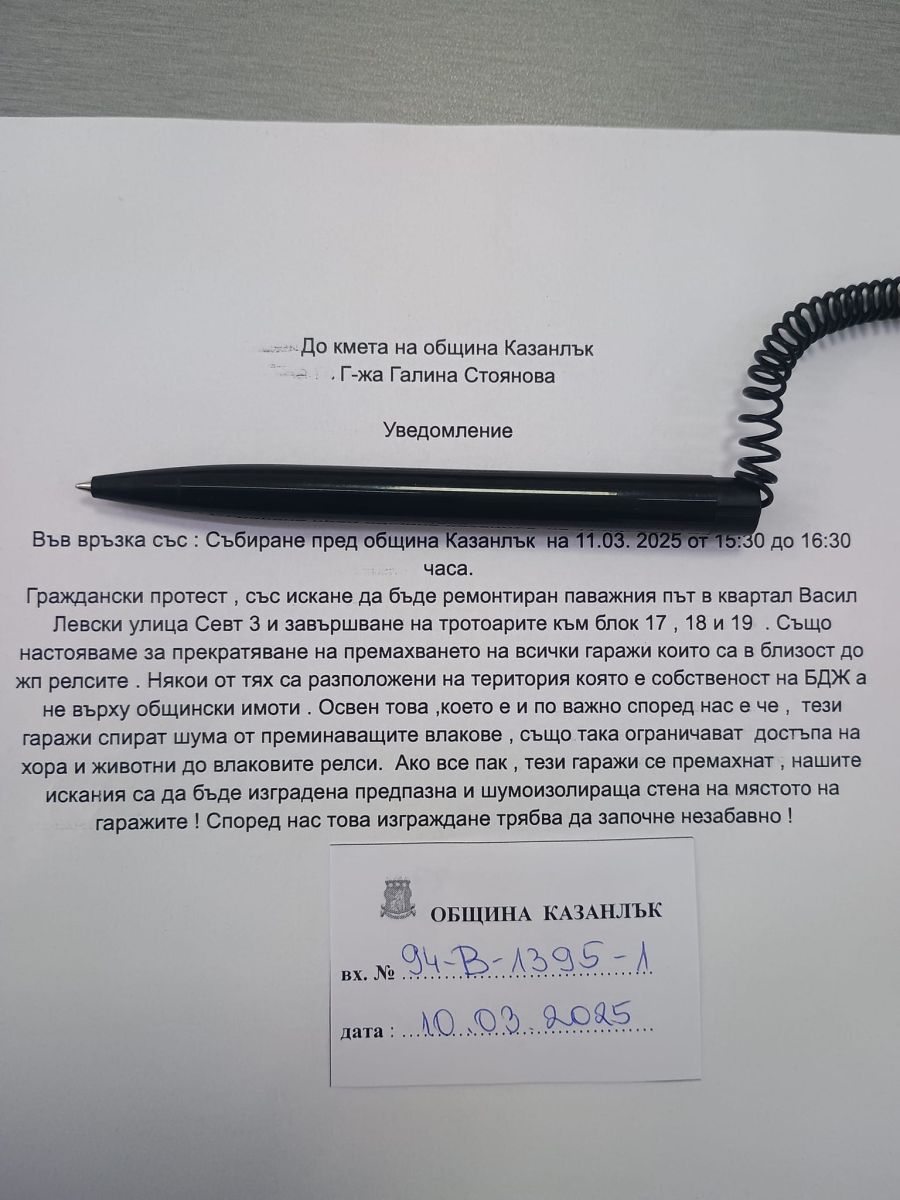 Казанлъчани организират протест, който ще се проведе на 11-ти март, от 15,30ч до 16,30ч. пред сградата на Общината. Протестът е с искане да бъде отремонтиран паважния път в западната част на града, да бъдат завършени тротоарите на ул"Севт 3" към блоковете 17, 18 и 19, и да бъдат запазени част от металните гаражи. Настояването на гражданите е заради шума от преминаващите влакове.