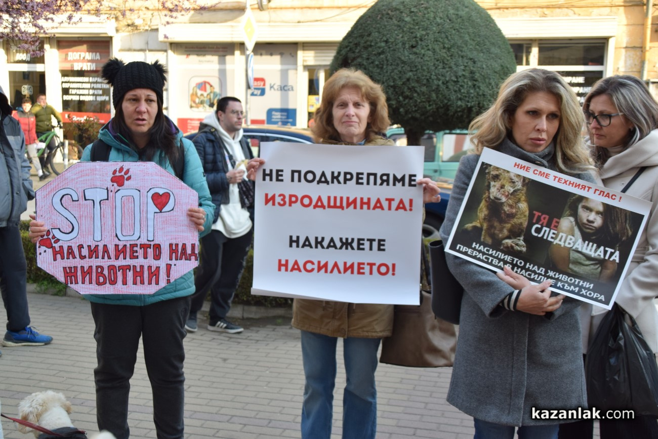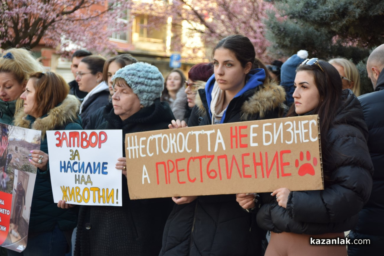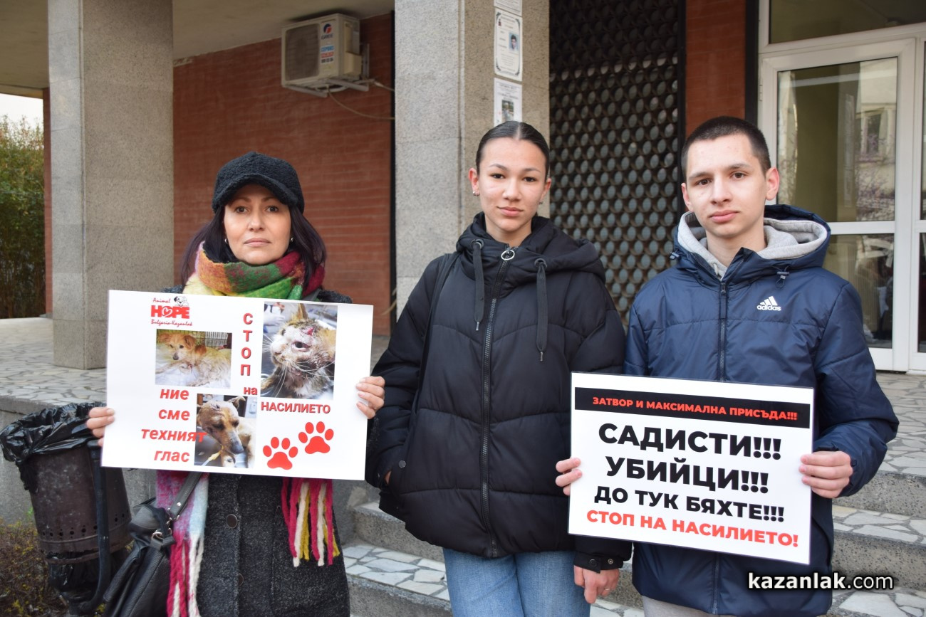 В Казанлък се проведе граждански протест пред сградата на Районния съд, с искания за справедливи присъди спрямо 26-годишната Габриела С. и 35-годишният Красимир П. от Перник, които бяха задържани и обвинени в жестокост към животни.