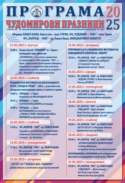 На 21 март 2025 г. започват „Чудомировите празници” в Павел баня. Те се организират от Общината, кметство – село Турия, НЧ „Чудомир – 1905” – с. Турия, НЧ „Напред – 1903” – гр. Павел баня, и Инициативен комитет. В тазгодишната програма са включени две изложби, пет комедийни спектакъла, два джаз концерта и представяне на вечерната обредност, характерна за кукерските игри в региона, посредством въртене на олалии, прескачане на огньове, изложба на традиционни ястия и др.