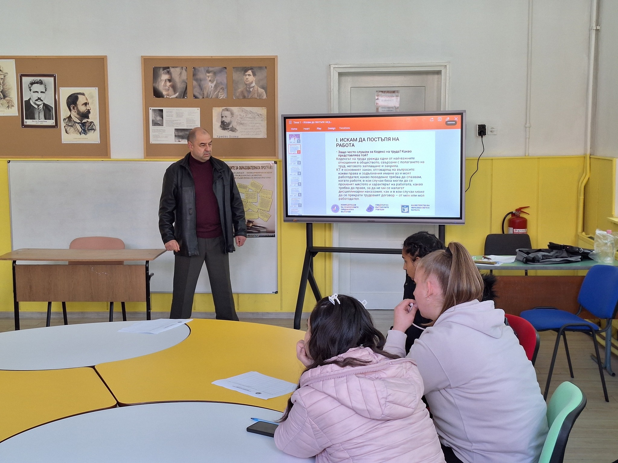 Гост-лектор бе г-н Николай Маринов, общински координатор на КНСБ, който подробно обясни на гимназистите, какво представлява Кодексът на труда.