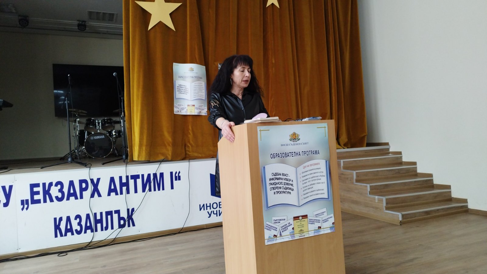 Прокурор Катя Добрева от Районна прокуратура - Стара Загора изнесе открит урок пред ученици от 6 и 11 клас от СУ "Екзарх Антим I" в гр. Казанлък. Пред тях бяха представени темите: "Как може да защитим правата си чрез съдебните институции? Видове съдебни услуги. Достъп до правосъдие. Децата и компютърните/киберпрестъпленията. Опасностите в интернет и социалните мрежи. Защита на личните данни в интернет пространството. Пътно-транспортни престъпления и нарушения. Пътна безопасност".