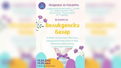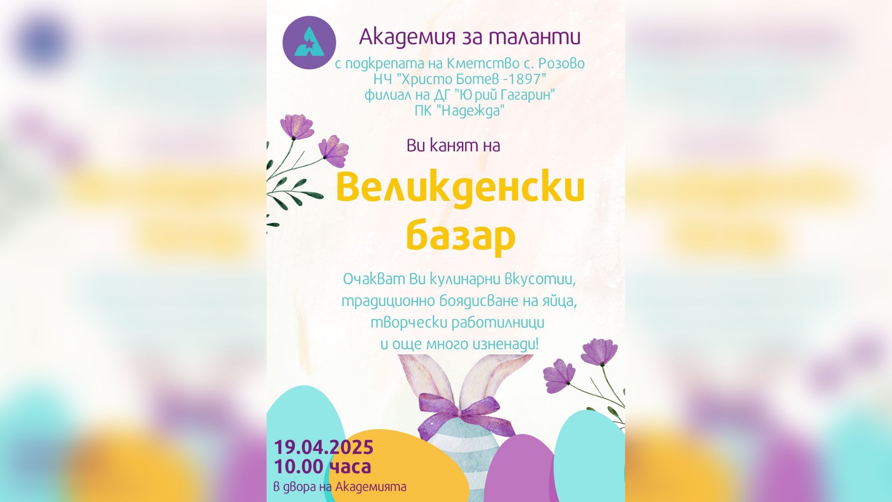 По повод Великден, Академията за таланти в село Розово организира тематичен празничен базар. Събитието ще се състои на 19 април 2025 г. (събота) от 10:00 часа в двора на Академията и се организира с подкрепата на Кметство село Розово, НЧ „Христо Ботев – 1897“, филиал на ДГ „Юрий Гагарин“ и ПК „Надежда“.