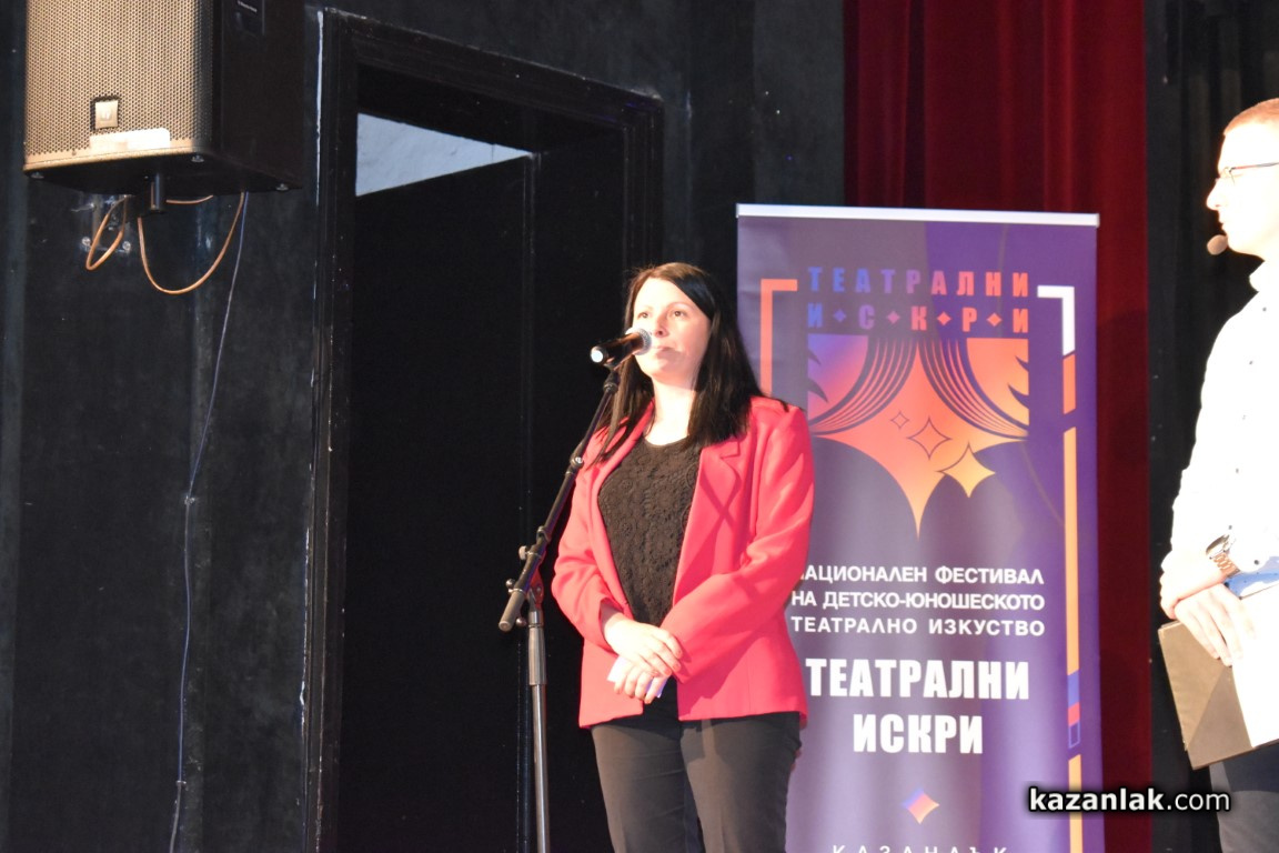 Иванова отправи благодарности към ръководителите на театралните състави, на родителите и приятелите на театъра, като допълни, че без тях, фестивали като "Театрални искри" не могат да бъдат факт. Благодарности бяха отправени към подкрепящата публика и всички съмишленици на фестивала.