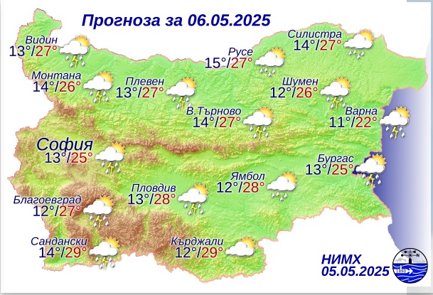 През нощта в по-голямата част от страната ще преобладава ясно време, с разкъсана средна и висока облачност. На отделни места все още ще има краткотрайни превалявания от дъжд. Ще духа слаб южен вятър. Минималните температури ще бъдат между 10° и 15°, в София – около 13°. Утре ще преобладава слънчево време. След обяд и вечерта ще се развива купеста и купесто-дъждовна облачност. Ще има краткотрайни валежи, придружени с гръмотевици. В Западна и Северна България се повишава вероятността за локални значителни количества и градушки. Ще духа слаб до умерен вятър от запад-югозапад, в Дунавската равнина ще се ориентира от запад-северозапад. Максималните температури ще бъдат между 25° и 30°, в София – около 25°.