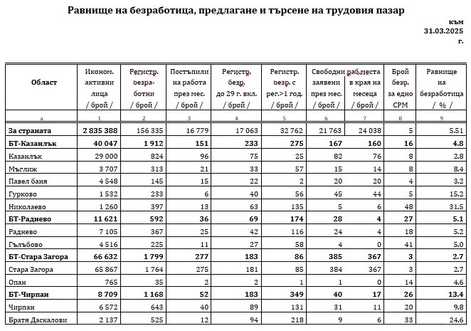 През месец март в бюрата по труда от област Стара Загора са заявени общо 585 свободни работни места на първичен пазар. Равнището на безработица през месец март 2025г. е 4,31% при 5,49% за страната. Стойността за областта се запазва спрямо предходния месец /4,31%/, а спрямо месец март 2024г. /4,24%/ се увеличава 0,07% .