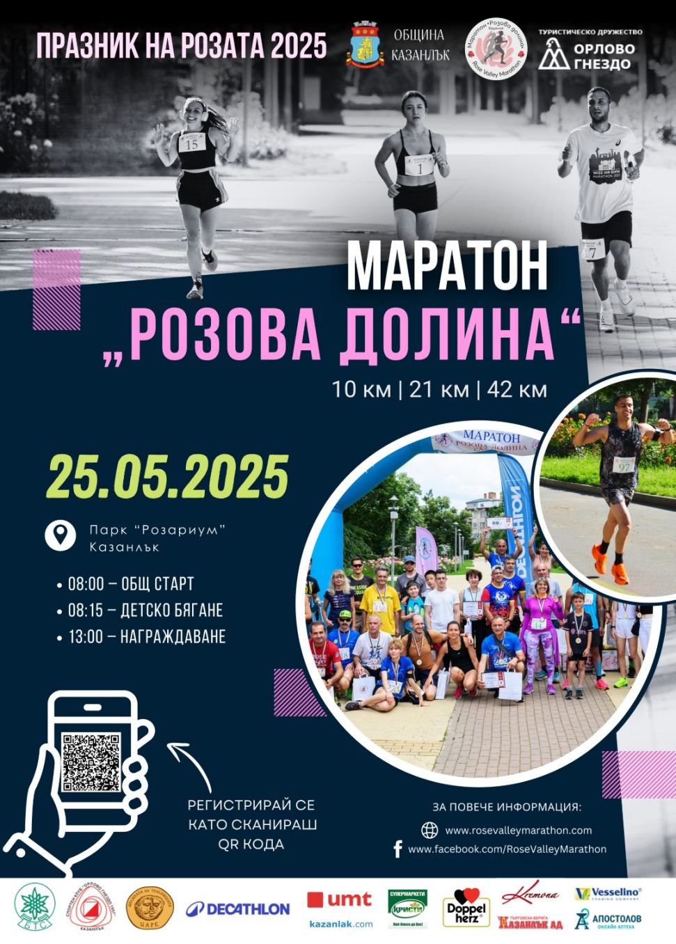 На 25 май 2025 г., от 08:00 ч., Казанлък отново ще се превърне в арена на спортния дух и красотата на природата с провеждането на четвъртото издание на Маратон „Розова долина“. Събитието се организира от Община Казанлък и Туристическо дружество „Орлово гнездо“ и има за цел да насърчи физическата активност и здравословния начин на живот, като същевременно разкрие очарованието на един от най-живописните региони в България.