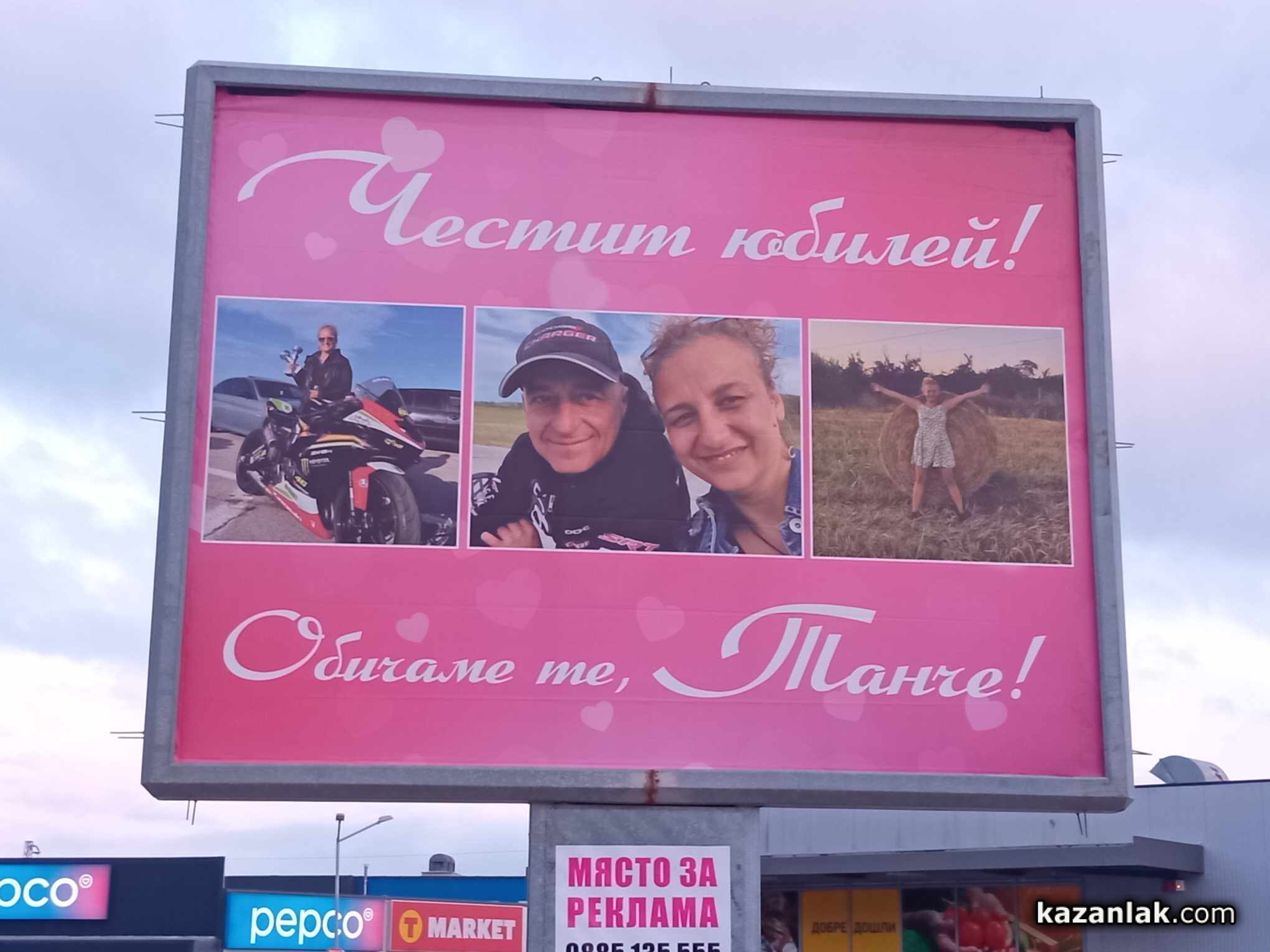 На красив жест станаха свидетели казанлъчани. Причината, която разкрива транспаранта, е юбилей, а щастливката, която е причината за тази ценна емоция носи името Татяна, разбираме още от него.