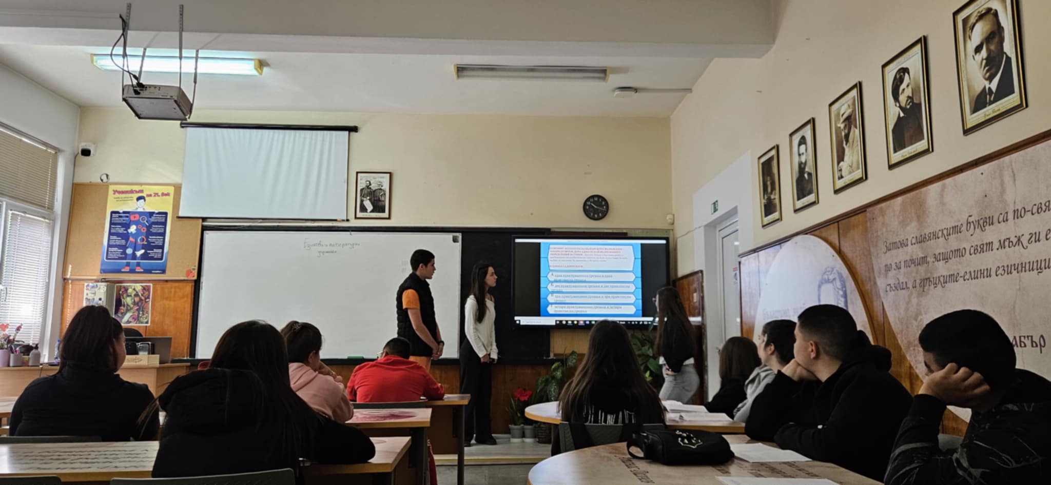 В ролята на учител по БЕЛ влезе Мария Добрева от 9.а клас, която с помощта на преподавателя Диана Хаджиатанасова бе подготвила интересна игра, с която предизвика съучениците си да покажат познания както за езиковите норми и правила, така и за творчеството на изучаваните автори от българската литература.
