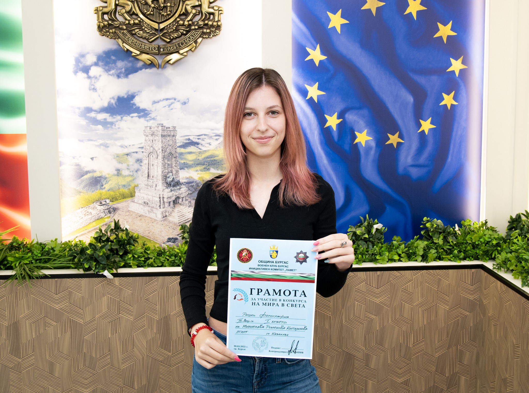 Снимките на младата ни фотографка впечатлиха журито и заслужено бяха отличени. Конкурсът се организира от Областен съюз на офицерите и сержантите от запаса и резерва /СОСЗР/- Бургас, Областен съюз на ветераните от войните на България /СВВБ/ - Бургас, Гарнизонен военен клуб /ГВК/ - Бургас, със съдействието на Община Бургас.