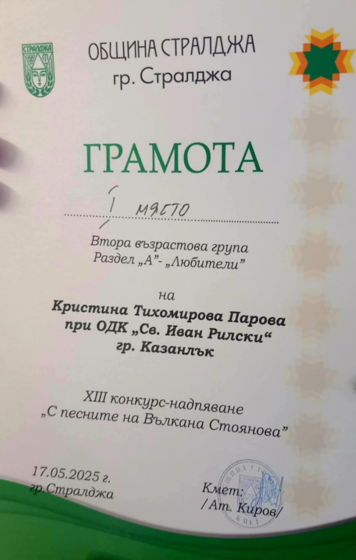 Кристина Парова завоюва първа награда, във втора възрастова група на един от най-престижните певчески конкурси в страната - Xlll конкурс-надпяване "С песните на Вълкана Стоянова", който се проведе в град Стралджа на 17 май.