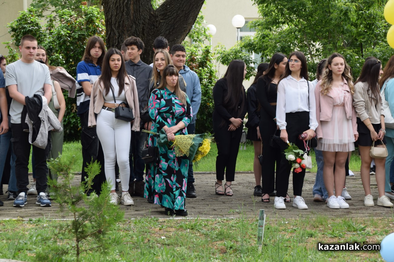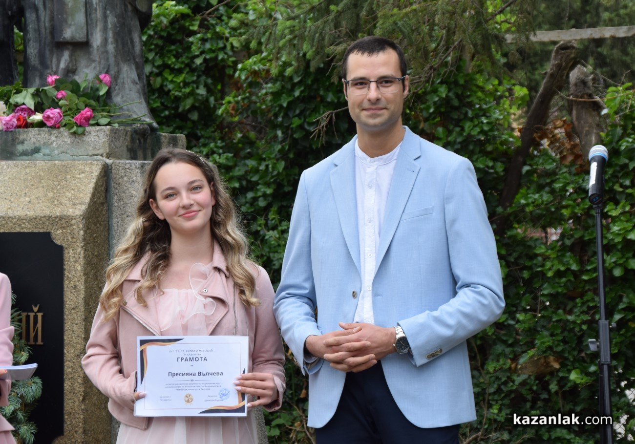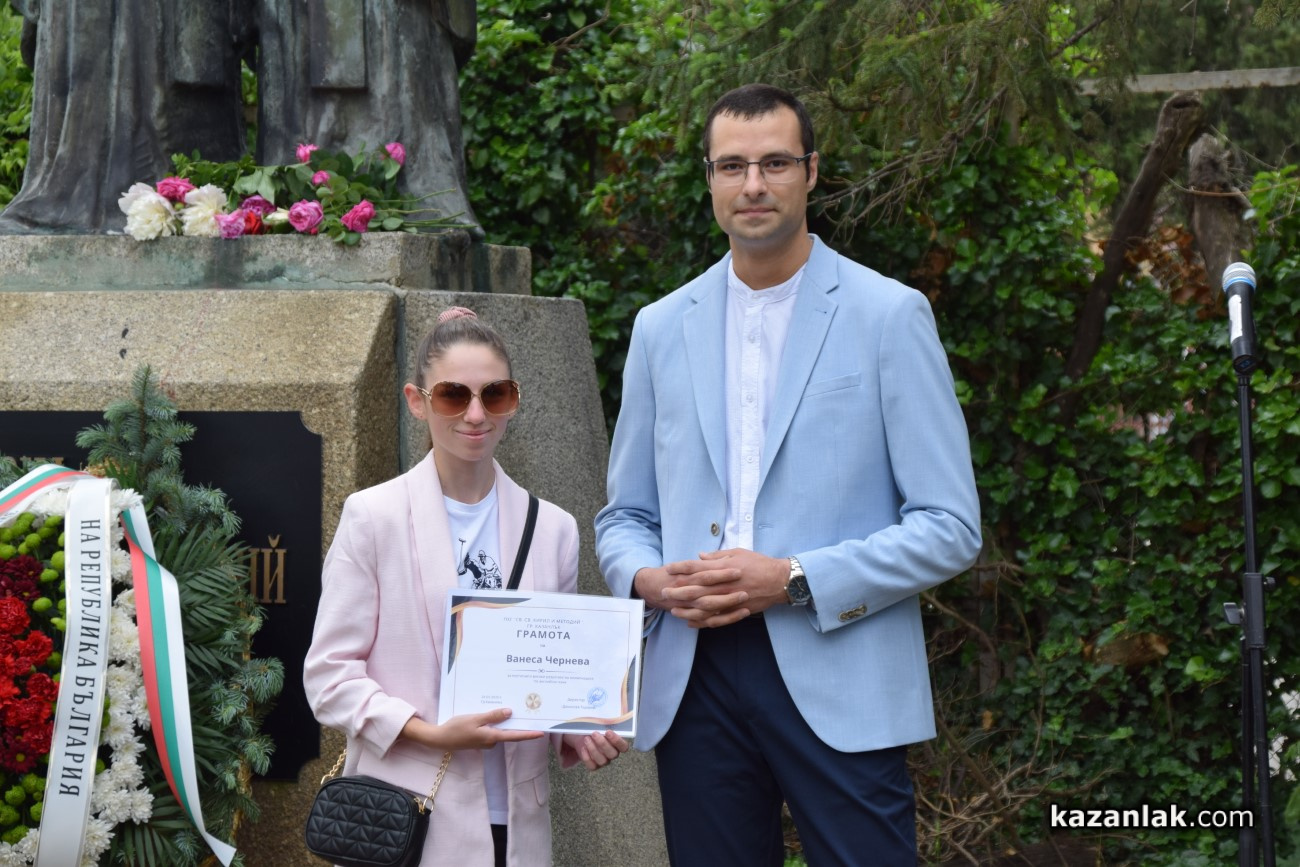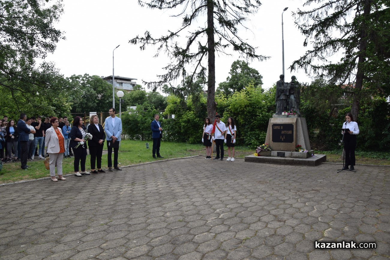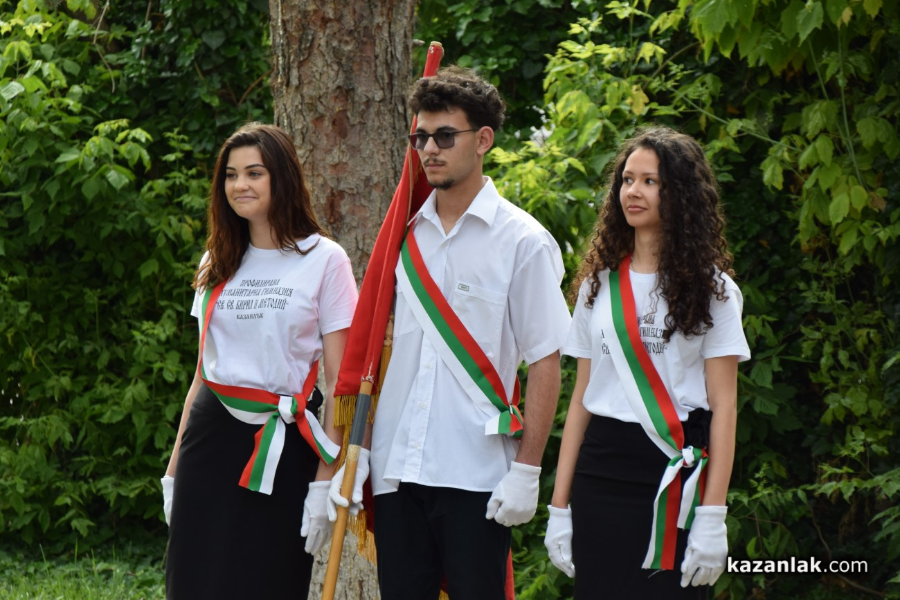 В Деня на българската просвета и култура и на славянската писменост – 24 май, Хуманитарната гимназия в Казанлък, която носи имената на светите братя Кирил и Методий, отбеляза празника с тържествена церемония в своя двор. Събитието премина под знака на духа, традицията и уважението към делото на създателите на славянската писменост. На церемонията присъстваха ученици, учители, ръководството на училището, както и Председателят на Народното събрание Наталия Киселова – възпитаник на гимназията.
