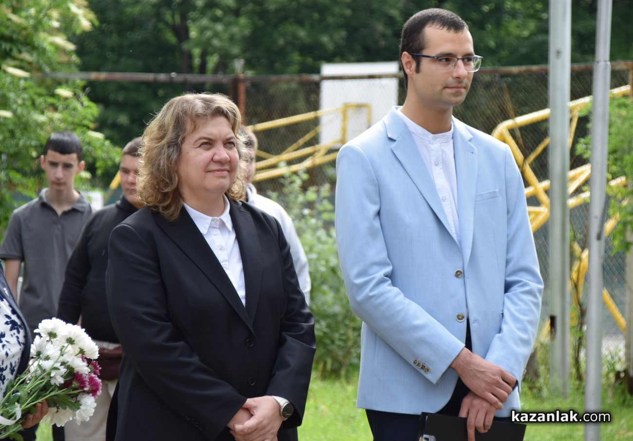 Хуманитарната гимназия в Казанлък има 142-годишна история и продължава да пази и предава ценностите на просветата и културата. През 1933г. в двора на казанлъшкото педагогическо училище, днес ПХГ "Св.Св. Кирил и Методий", е издигнат първият паметник на светиите братя на територията на страната от учителя Иван Топалов. Днес, години по-късно, всички присъстващи на тържеството в казанлъшката гимназия отдадоха почит пред него и поднесоха цветя, символ на признателност.