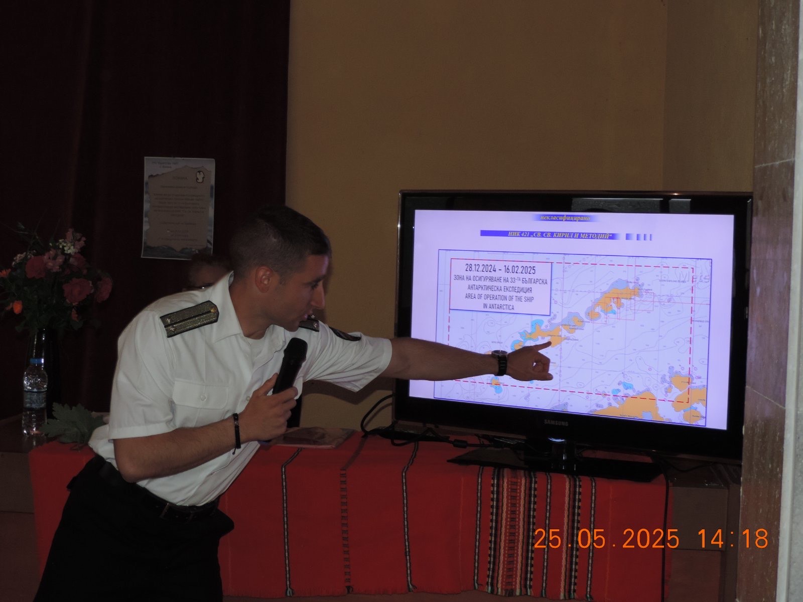 33-та Българска Антарктическа експедиция, с доставените 80 тона товар до Южните Шетландски острови, е преминала повече от успешно благодарение на членовете на екипажа на НИК “Св. Св. Кирил и Методий”, начело с капитан II ранг - Радко Муевски, което научихме от презентацията.