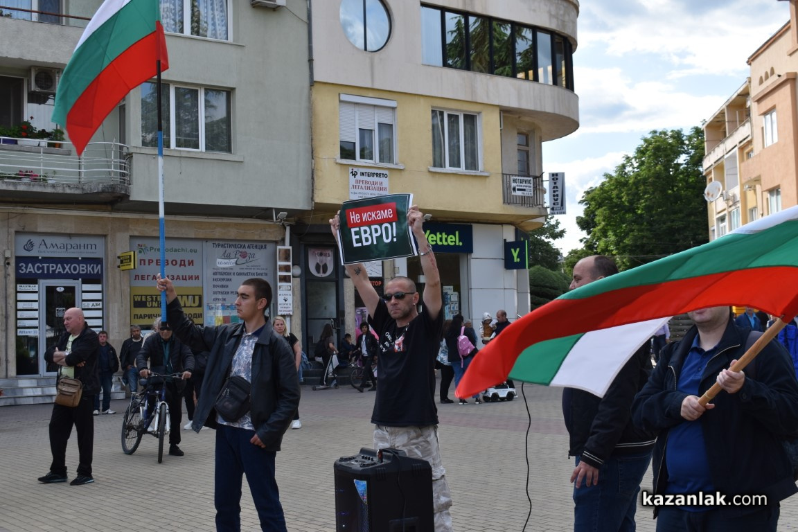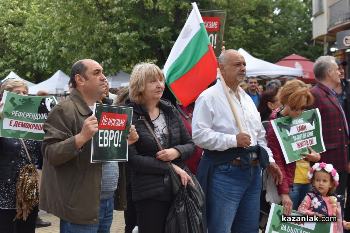 Десетки граждани се събраха днес в центъра на Казанлък на протест с настояване за провеждане на национален референдум относно приемането на еврото като официална валута в България. Протестиращите скандираха "Оставка" и "Референдум", изразявайки несъгласие с възможното въвеждане на еврото без пряко допитване до народа.