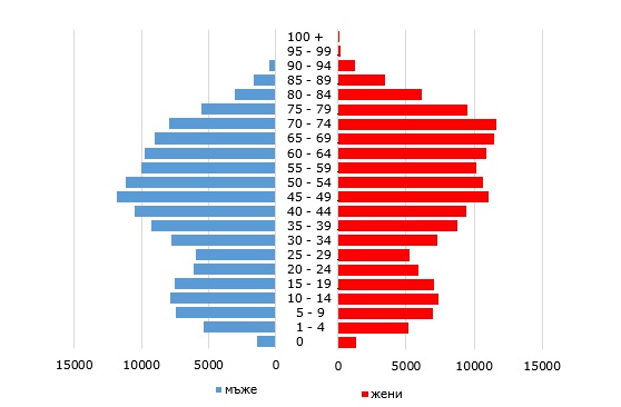 Към 31.12.2024 г. общият коефициент на възрастова зависимост е 65.1% при 61.3% за страната, или на всяко лице в зависимите възрасти (под 15 и над 65 години) се падат по-малко от две лица в активна възраст.