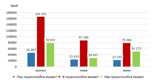 Към края на 2024 г. над трудоспособна възраст са 78 689 души, или 27.2%, а под трудоспособна възраст – 45 554 души, или 15.8% от населението на областта.